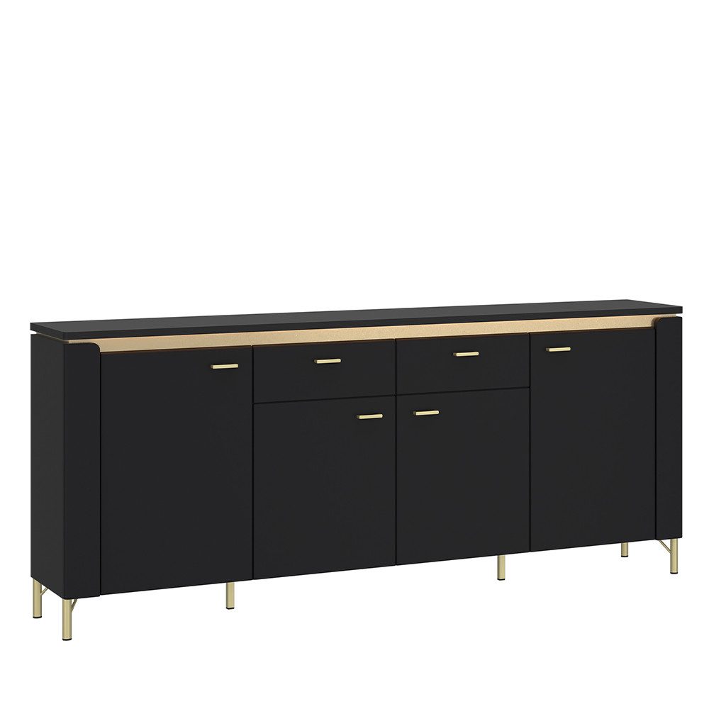 Die elegante Kombination aus mattem Schwarz, goldfarbenen Akzenten und integrierter Akzentbeleuchtung macht dieses universell einsetzbare Sideboard zu einem echten Blickfang. Mit vier Türen, zwei Schubladen und fünf Einlegeböden, ausgestattet mit stilvollen Griffen bietet es großzügigen Stauraum für TV-Zubehör, Dekorationsartikel oder andere persönliche Gegenstände. Hochwertige Metallbeschläge und -scharniere sorgen für Stabilität und Langlebigkeit. Die widerstandsfähige Melaminharzbeschichtung macht das Sideboard besonders pflegeleicht und unempfindlich gegenüber äußeren Einflüssen. Perfekt für das Wohnzimmer oder als stilvolle Aufbewahrungslösung im Flur – dieses Sideboard verbindet Ästhetik und Funktionalität.