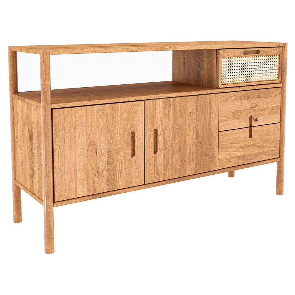 Die zwei Türen bieten Platz für zwei Einlegeböden, während die drei Schubladen – darunter eine mit stilvoller Rattanfront – zusätzlichen Stauraum bieten. Ein offenes Fach rundet das Design ab und sorgt für eine luftige, moderne Ausstrahlung. Mit grifflosen Türen und Softclose-Technologie schließen alle Elemente sanft und leise.