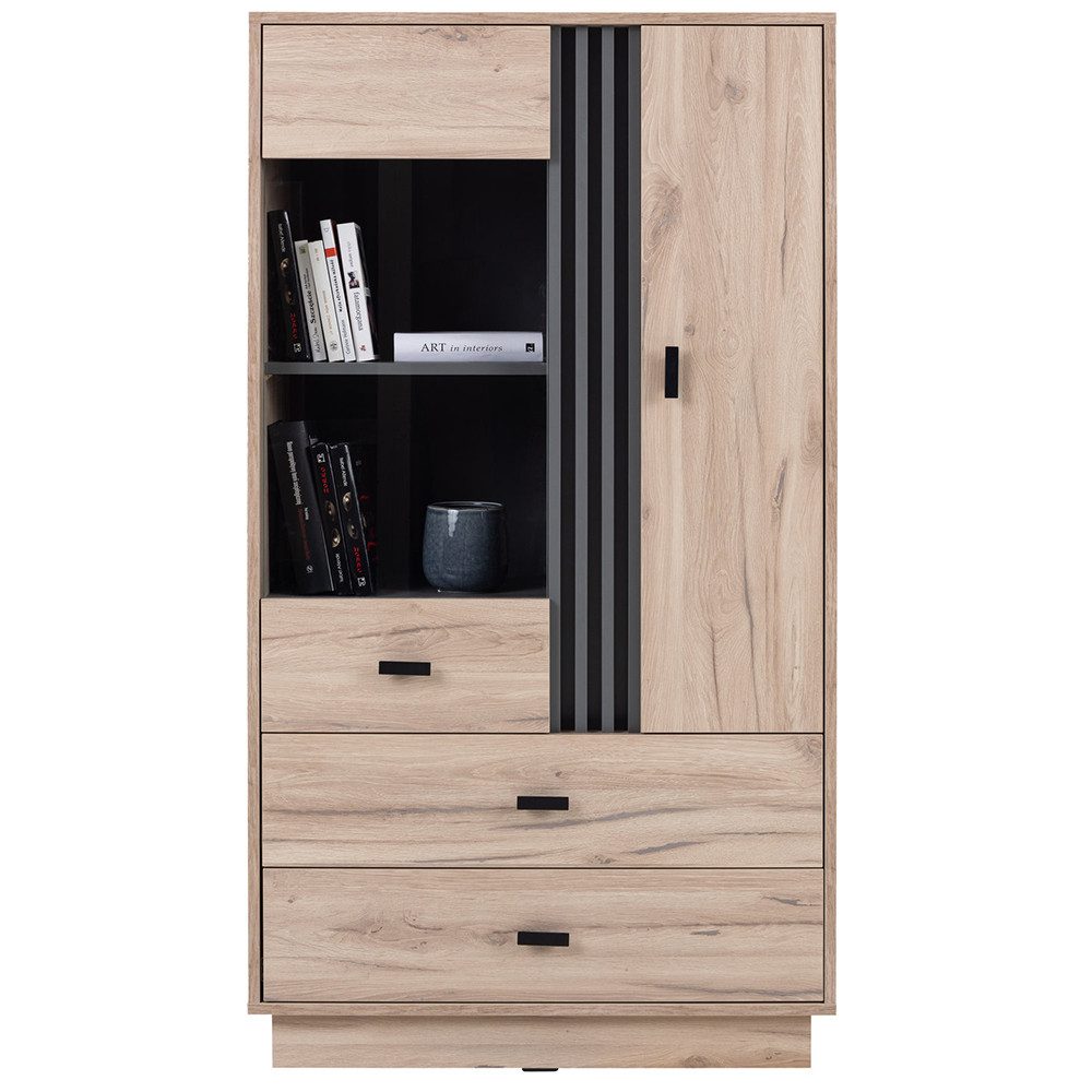 Diese stilvolle Vitrine bringt Ordnung und Eleganz in Dein Zuhause. Die warme Eiche-Optik trifft auf anthrazitfarbene Akzente und eine elegante Glastür, hinter der Deine Lieblingsstücke perfekt zur Geltung kommen. Im Inneren findest Du mehrere Fächer für Gläser, Deko oder Sammlerstücke, während eine Schublade und zusätzliche Tür für zusätzlichen Stauraum sorgen. Ein modernes Möbelstück, das Charme versprüht und Dein Wohnzimmer sichtbar aufwertet.