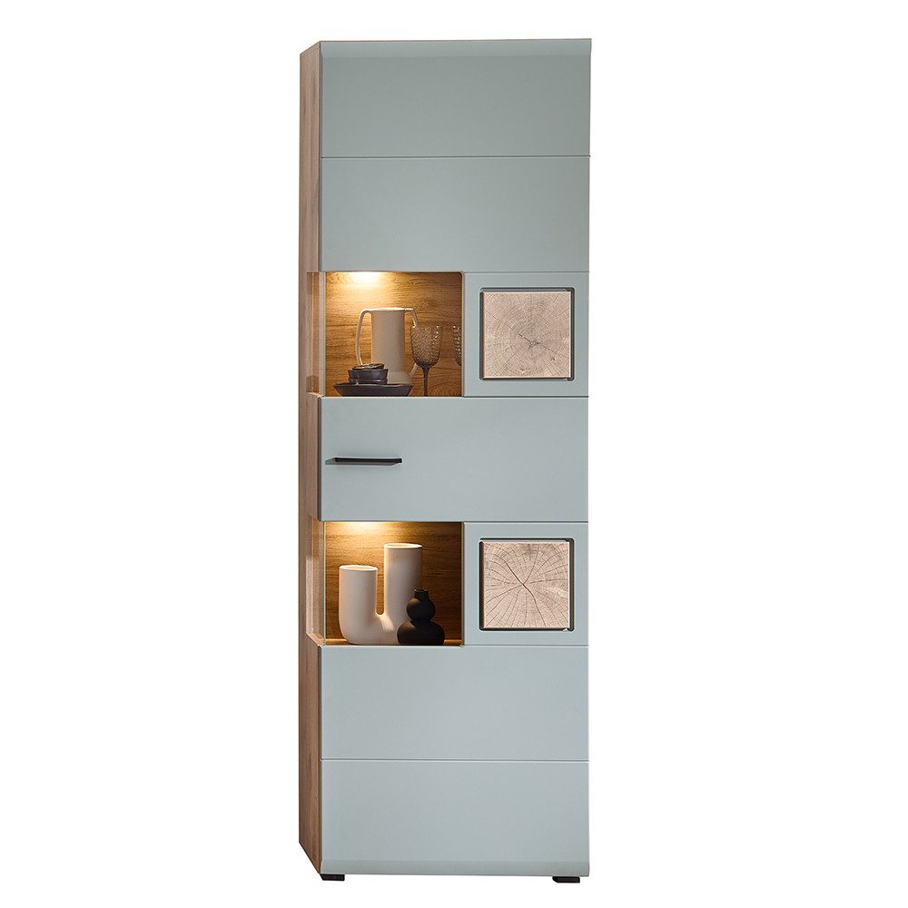 Korpusse in Eiche treffen auf Fronten in stilvollem Schilfgrün, veredelt durch markante Hirnholz-Applikationen, abgerundet durch praktische Softclose-Türen und -Schubladen.