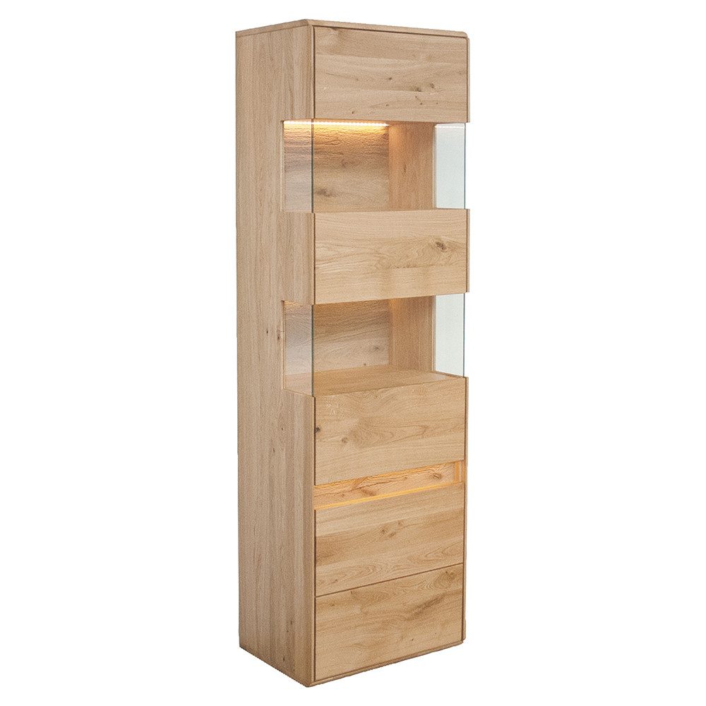 Die Kombination aus massiver Eiche, sanftem Licht und transparenter Leichtigkeit bringt Wärme und Charakter in dein Zuhause. Hinter der grifflosen Front verbirgt sich stilvoller Stauraum für deine Lieblingsstücke – perfekt in Szene gesetzt durch die integrierte Beleuchtung.