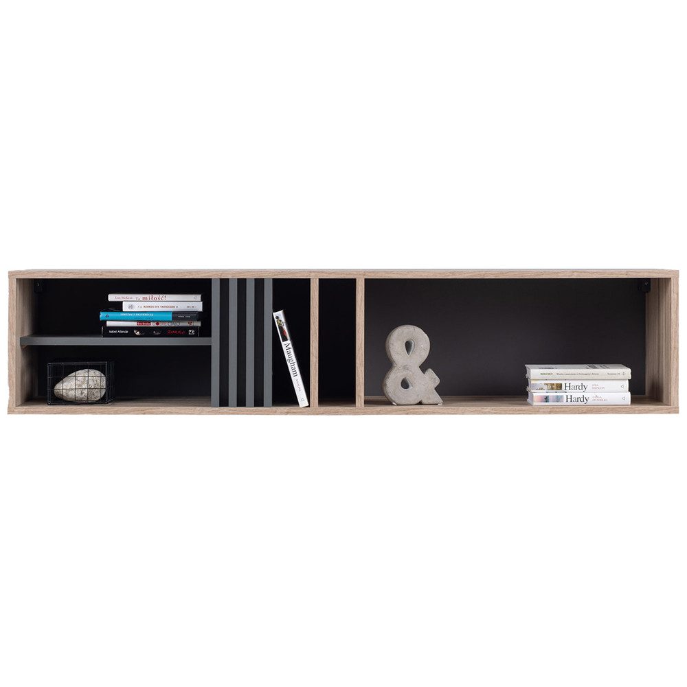 Dieses Wandregal verbindet klare Formen mit trendiger Optik – ideal, um leere Wände stilvoll zu beleben. Die warme Holzstruktur trifft auf eine anthrazitfarbene Rückwand und vertikale Zierleisten, die dem Design das gewisse Etwas verleihen. Drei offene Fächer und ein zusätzlicher Regalboden bieten Platz für Bücher, Deko oder kleine Alltagshelfer. Perfekt für Wohnzimmer, Büro oder Jugendzimmer – einfach montieren, dekorieren und wohlfühlen!