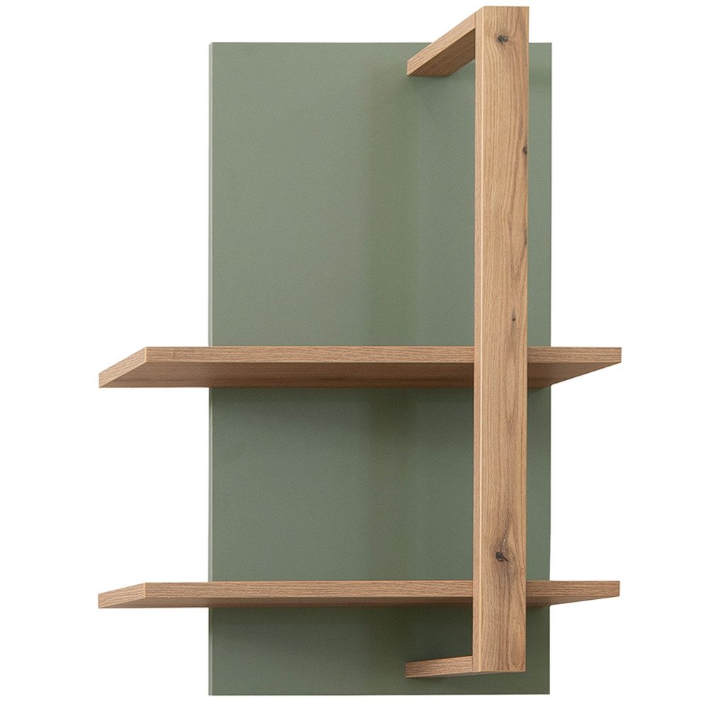 Dieses moderne, asymmetrische Wandregal verbindet stilvolles Design mit praktischer Ablagefläche. Die Kombination aus Salbei Grün und natürlicher Eiche Evoke sorgt für ein harmonisches Gesamtbild. Mit zwei Ablageflächen bietet es Platz für Bücher, Deko oder Pflanzen – ideal für Wohn- und Essbereiche. Dank verstellbarer Hängebeschläge lässt sich das Regal flexibel anbringen. Die melaminbeschichteten Oberflächen sind widerstandsfähig und pflegeleicht – eine langlebige Lösung für stilvolle Raumgestaltung.