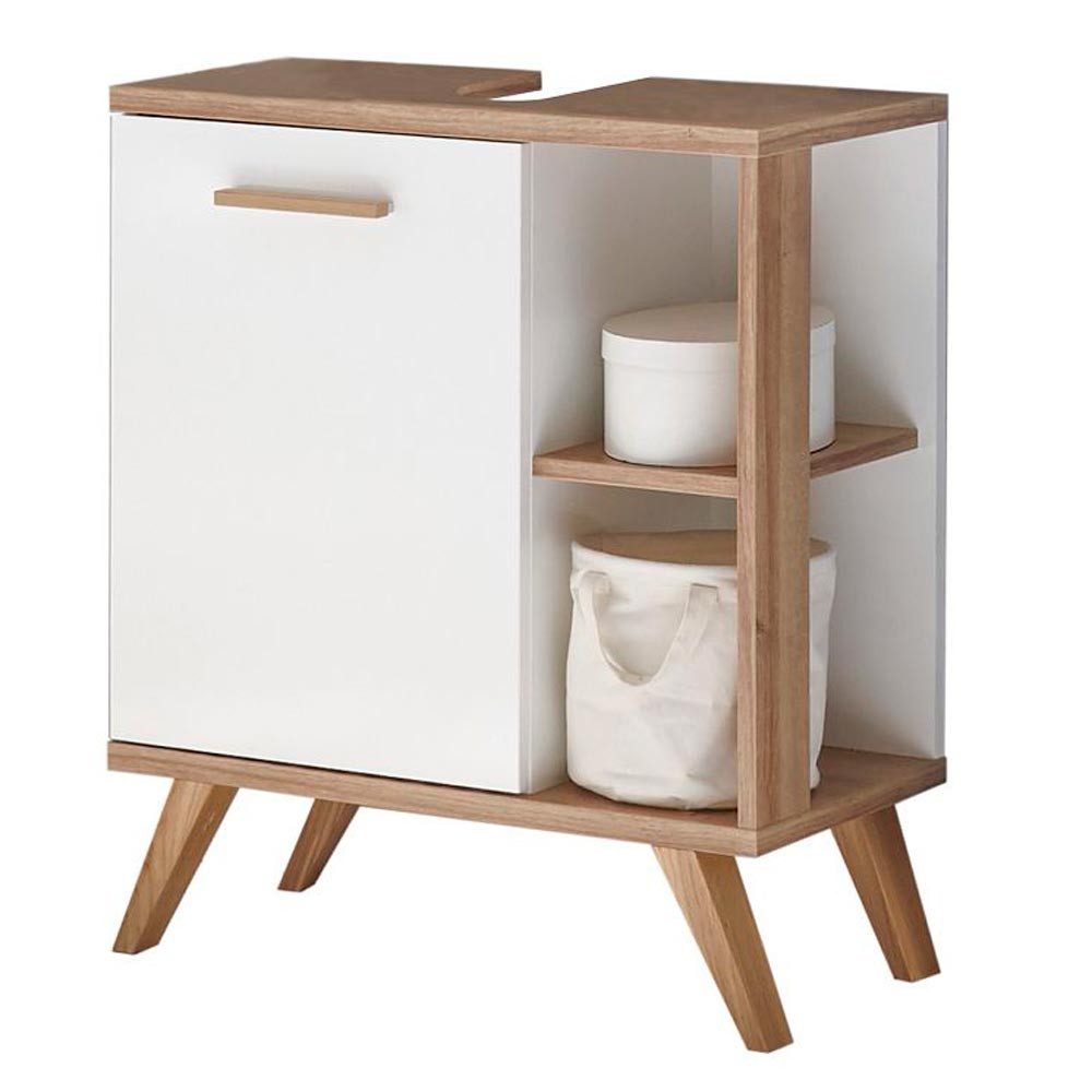 Skandinavisches, formschönes Design für Ihr Badezimmer ! Die Badezimmer Möbel-Serie MALANJE-66 setzt daher auf klare Formen, helle Farben und natürliche Materialien. Die Kombination aus Front und Korpus in weiß, gepaart mit Dekor Riviera Eiche quer bei den Ober- und Unterböden als auch den Griffen, Ablagen und den filigranen, abgeschrägten Füße wirkt stilsicher und ästhetisch. Bei allen Möbeln ist genug Stauraum vorhanden, so dass diese Badmöbel auch funktionell sind.