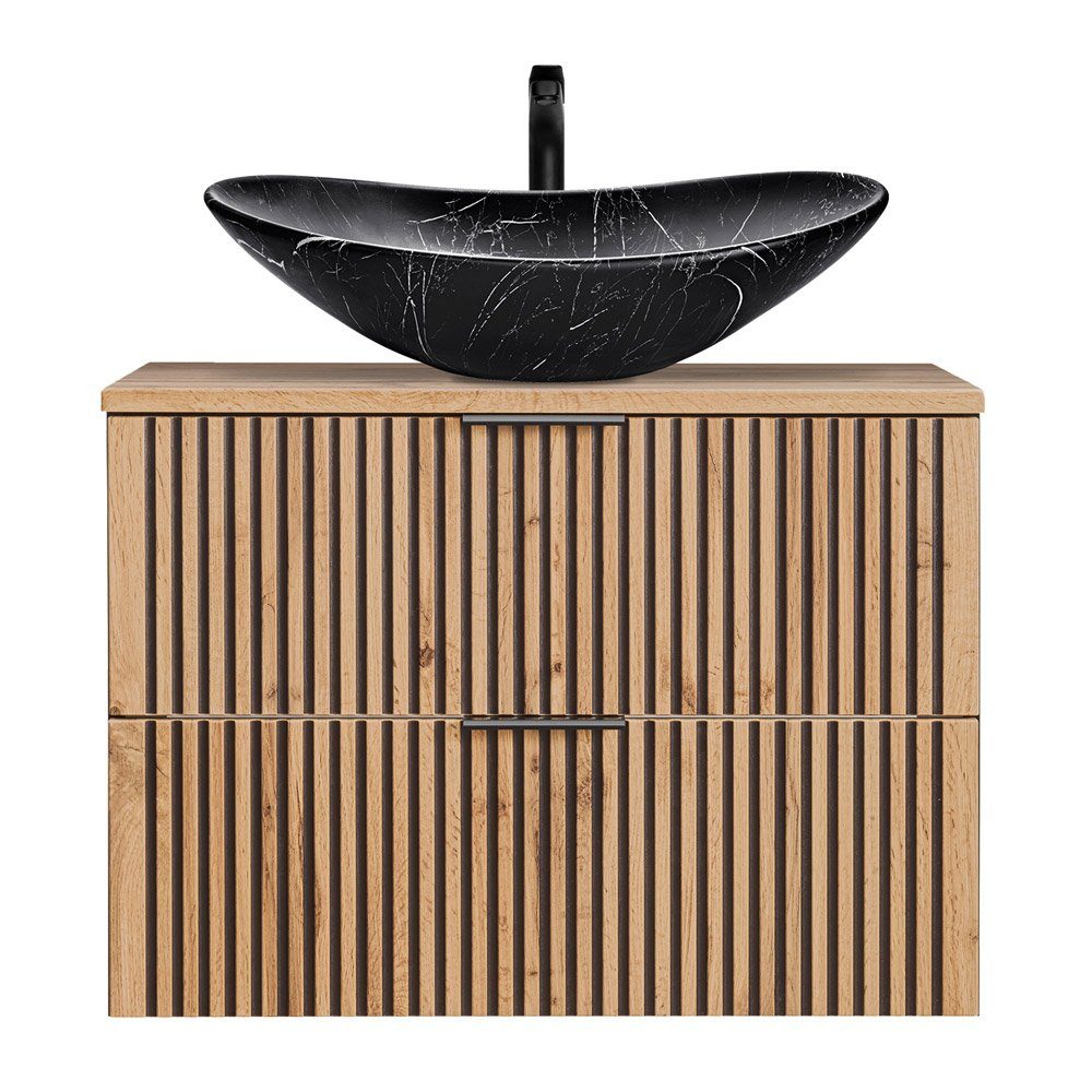 Setze mit unserer Serie XANTEN-56 dein Badezimmer in Szene. Die aufwändig gearbeiteten Fronten in Wotaneiche Nb. mit schwarzen Rillen unterstreichen das ausdrucksstarke und moderne Design der Badmöbel. Anthrazitfarbene Korpen und schwarze Griffe ergänzen die besondere Optik. Verschiedene Waschtisch- und Waschbeckenkombinationen lassen keine Wünsche offen. Komfortable Softclose-Systeme und MDF-Fronten unterstreichen die hochwertige Verarbeitung.
