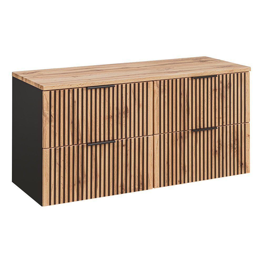 Die Front zeigt Wotan Eiche Nachbildung mit schwarzer Rillung – ein Design mit Wiedererkennungswert. Vier leichtgängige Schubladen mit Softclose sorgen für Ordnung im Alltag. Die durchgehende Waschtischplatte greift das Holzdekor auf und bringt Ruhe in das Gesamtbild.