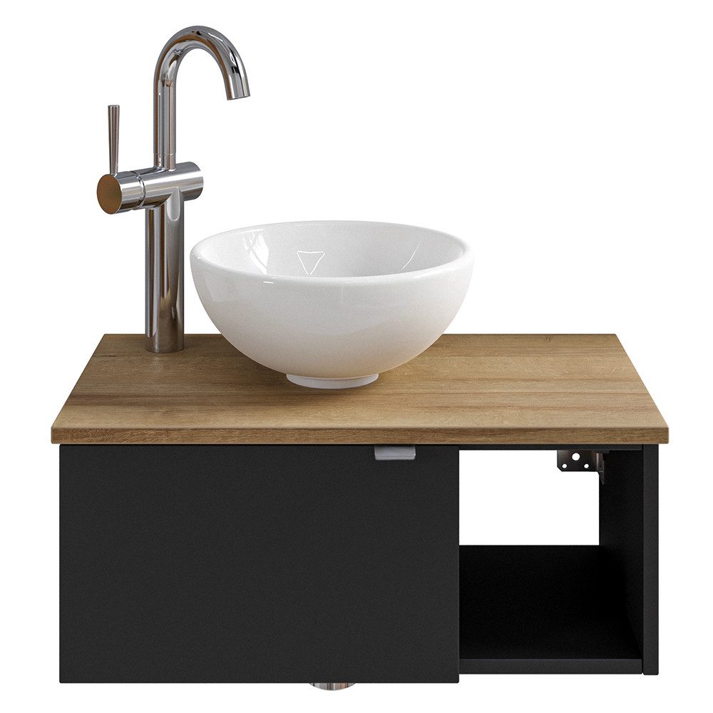 Stilvoll und praktisch zugleich – dieses Set ist eine ideale Wahl für dein Badezimmer. Der Waschtischunterschrank in schwarz matt mit einer Waschtischplatte in Eiche Nb. schafft ein modernes und elegantes Ambiente. Ein glänzend weißes Keramik-Aufsatzwaschbecken rundet das Design perfekt ab. Ein Griff in Edelstahloptik, Softclose-Türen und offener Stauraum bieten Komfort und Funktionalität. Diese Kombination aus minimalistischem Design und optimaler Raumnutzung passt perfekt in kleine Badezimmer.