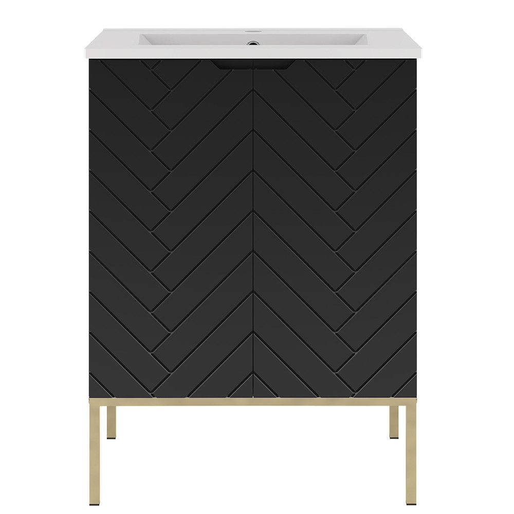 Dieser stilvolle Waschtisch in schwarz matt bringt modernes Design und Funktionalität in dein Badezimmer. Die grifflosen Fronten verleihen dem Möbelstück eine schlichte Eleganz, während das goldfarbene Fußgestell einen luxuriösen Akzent setzt und gleichzeitig Stabilität bietet. Hinter den zwei Softclose-Türen und einem Einlegeboden findest du großzügigen Stauraum für eine organisierte Aufbewahrung deiner Badutensilien. Das hochwertige Keramik-Waschbecken ist nicht nur robust, sondern auch pflegeleicht und ideal für den täglichen Gebrauch.