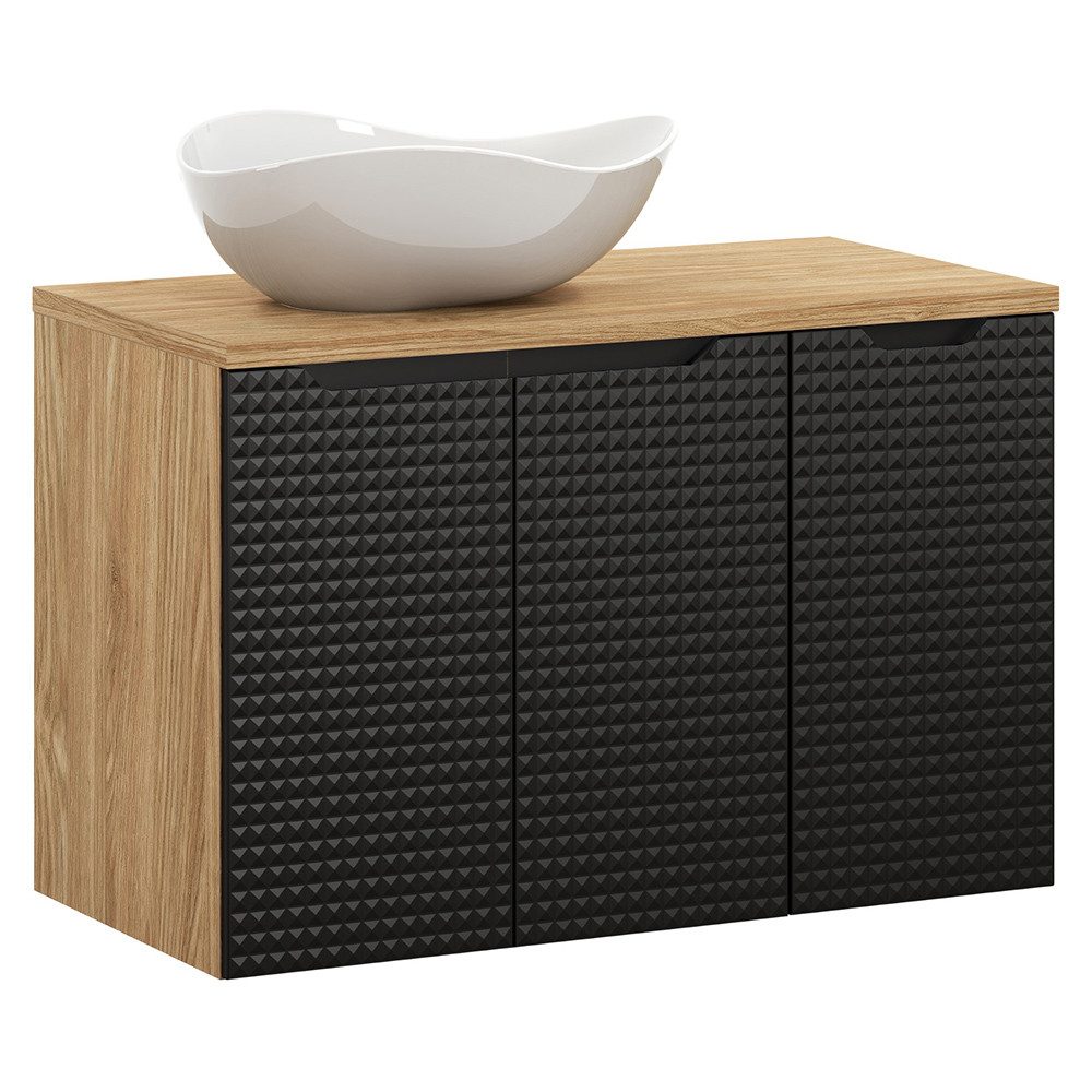 Erlebe unsere elegante Badmöbelserie, die durchdachtes Design und praktischen Komfort in deinem Badezimmer vereint. Die rustikale Eiche kombiniert mit den grifflosen, dunklen Fronten der Schränke schafft einen ansprechenden Kontrast. Все Elemente sind mit Softclose-Türen und -Schubladen ausgestattet, die für eine leise und sanfte Handhabung sorgen.