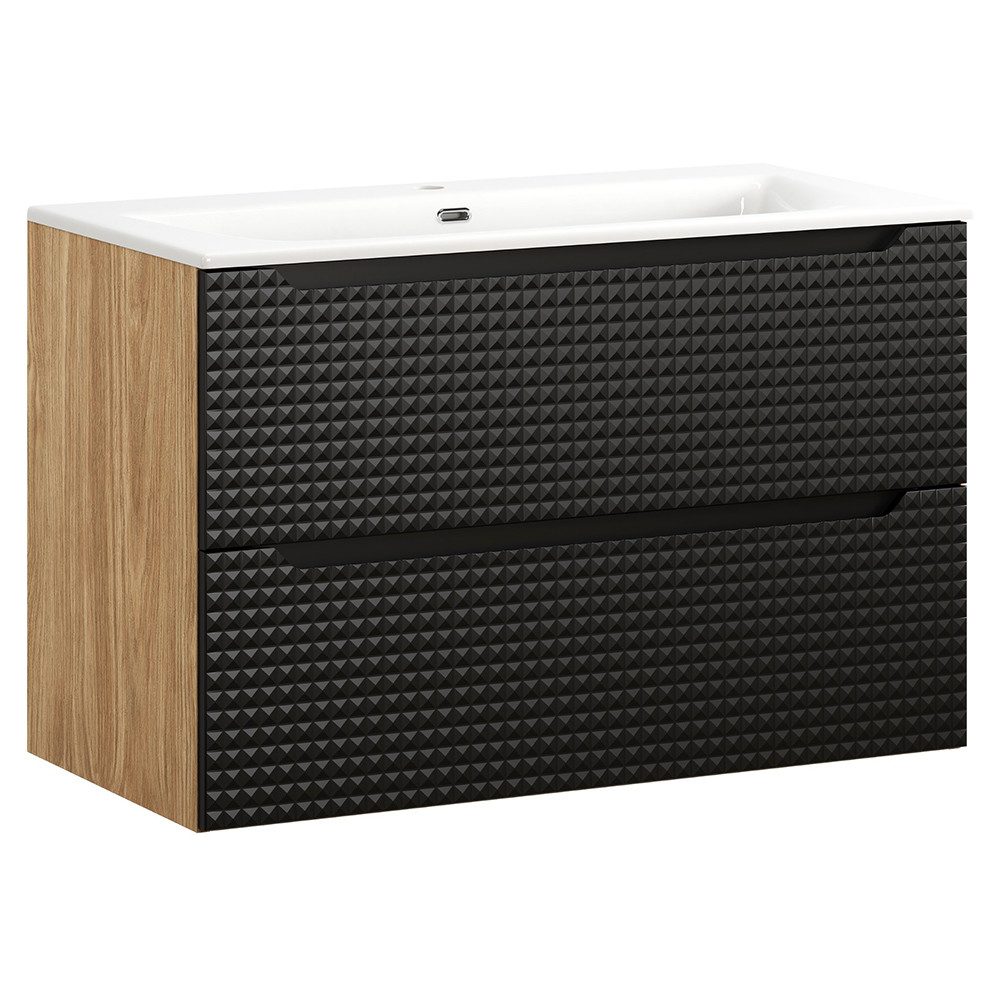 Erlebe unsere elegante Badmöbelserie, die durchdachtes Design und praktischen Komfort in deinem Badezimmer vereint. Die rustikale Eiche kombiniert mit den grifflosen, dunklen Fronten der Schränke schafft einen ansprechenden Kontrast. Все Elemente sind mit Softclose-Türen und -Schubladen ausgestattet, die für eine leise und sanfte Handhabung sorgen.