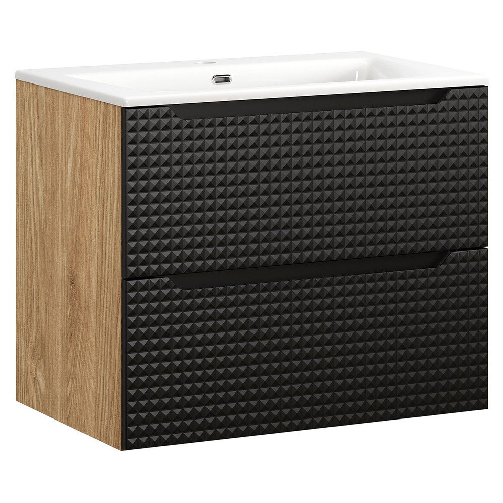 Erlebe unsere elegante Badmöbelserie, die durchdachtes Design und praktischen Komfort in deinem Badezimmer vereint. Die rustikale Eiche kombiniert mit den grifflosen, dunklen Fronten der Schränke schafft einen ansprechenden Kontrast. Все Elemente sind mit Softclose-Türen und -Schubladen ausgestattet, die für eine leise und sanfte Handhabung sorgen.
