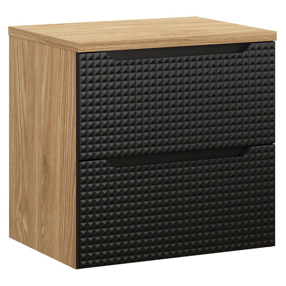 Erlebe unsere elegante Badmöbelserie, die durchdachtes Design und praktischen Komfort in deinem Badezimmer vereint. Die rustikale Eiche kombiniert mit den grifflosen, dunklen Fronten der Schränke schafft einen ansprechenden Kontrast. Все Elemente sind mit Softclose-Türen und -Schubladen ausgestattet, die für eine leise und sanfte Handhabung sorgen.