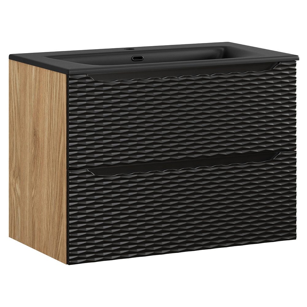 Der Korpus in Eiche und die grifflosen Fronten in schwarz mit einer 3D-Struktur in Wellenoptik bringen einen Hauch von Luxus in dein Badezimmer.
