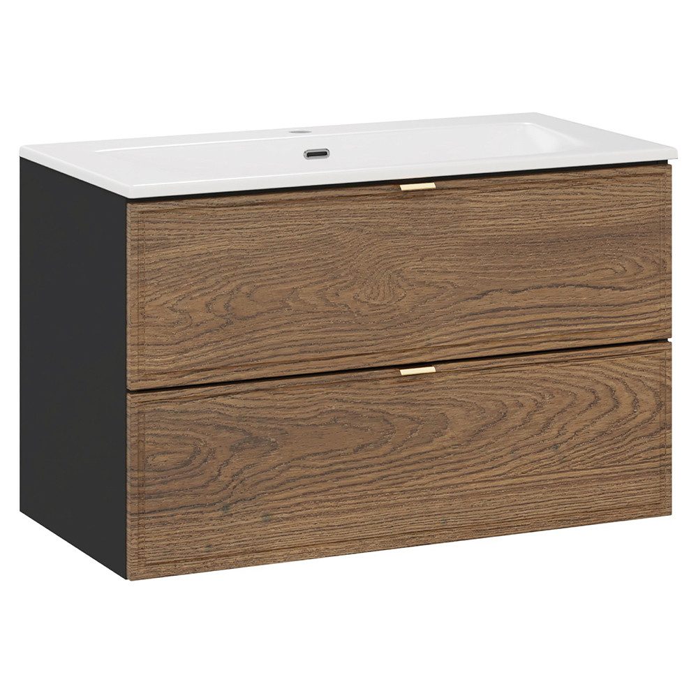 Die Front in Casella Eiche Nachbildung verleiht eine warme Holzoptik, während der matte schwarze Korpus für einen modernen Akzent sorgt. Zwei großzügige Schubladen bieten praktischen Stauraum und schließen dank Softclose sanft und geräuschlos. Mit einer Breite von 80 cm ideal für mittelgroße bis große Badezimmer.