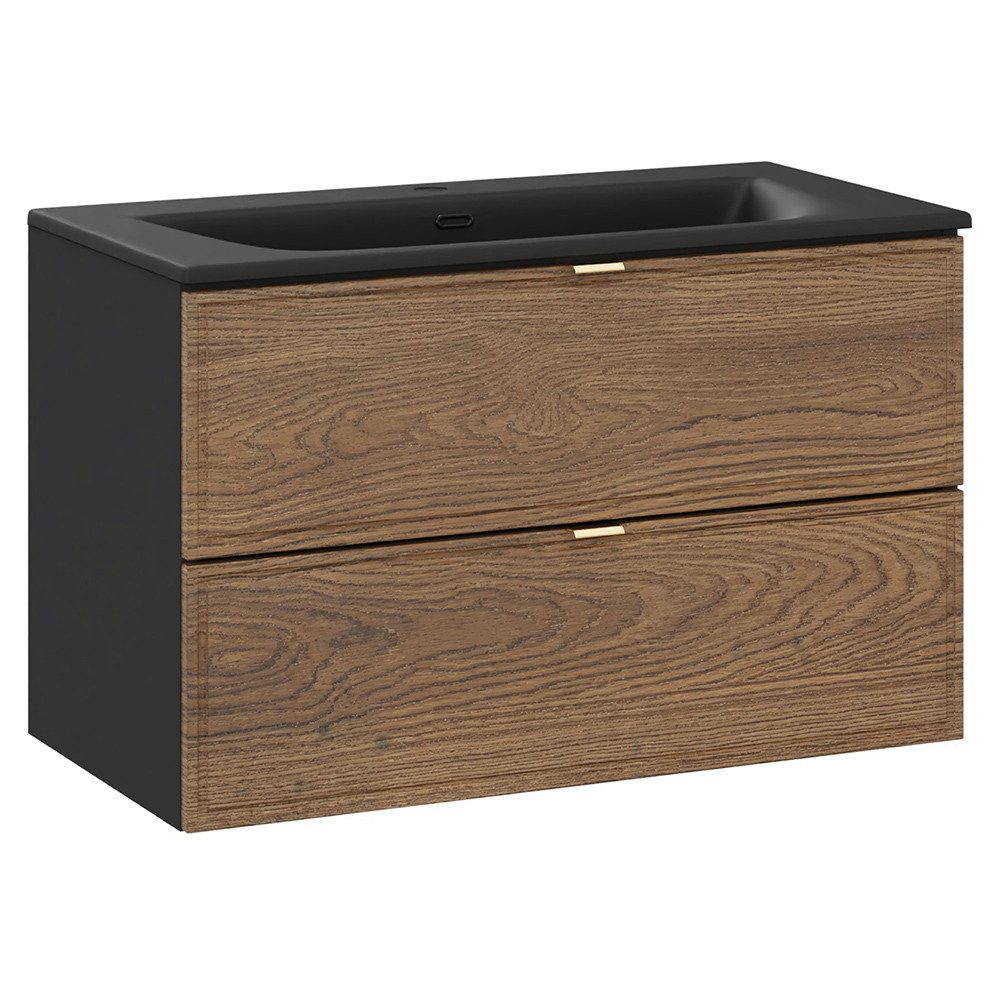 Die Front in Casella Eiche Nachbildung verleiht eine warme Holzoptik, während der matte schwarze Korpus einen modernen Kontrast schafft. Zwei großzügige Schubladen bieten viel Stauraum für Pflegeprodukte und schließen dank Softclose sanft und leise. Mit 80 cm Breite ist dieser Waschtisch ideal für mittelgroße bis große Badezimmer.