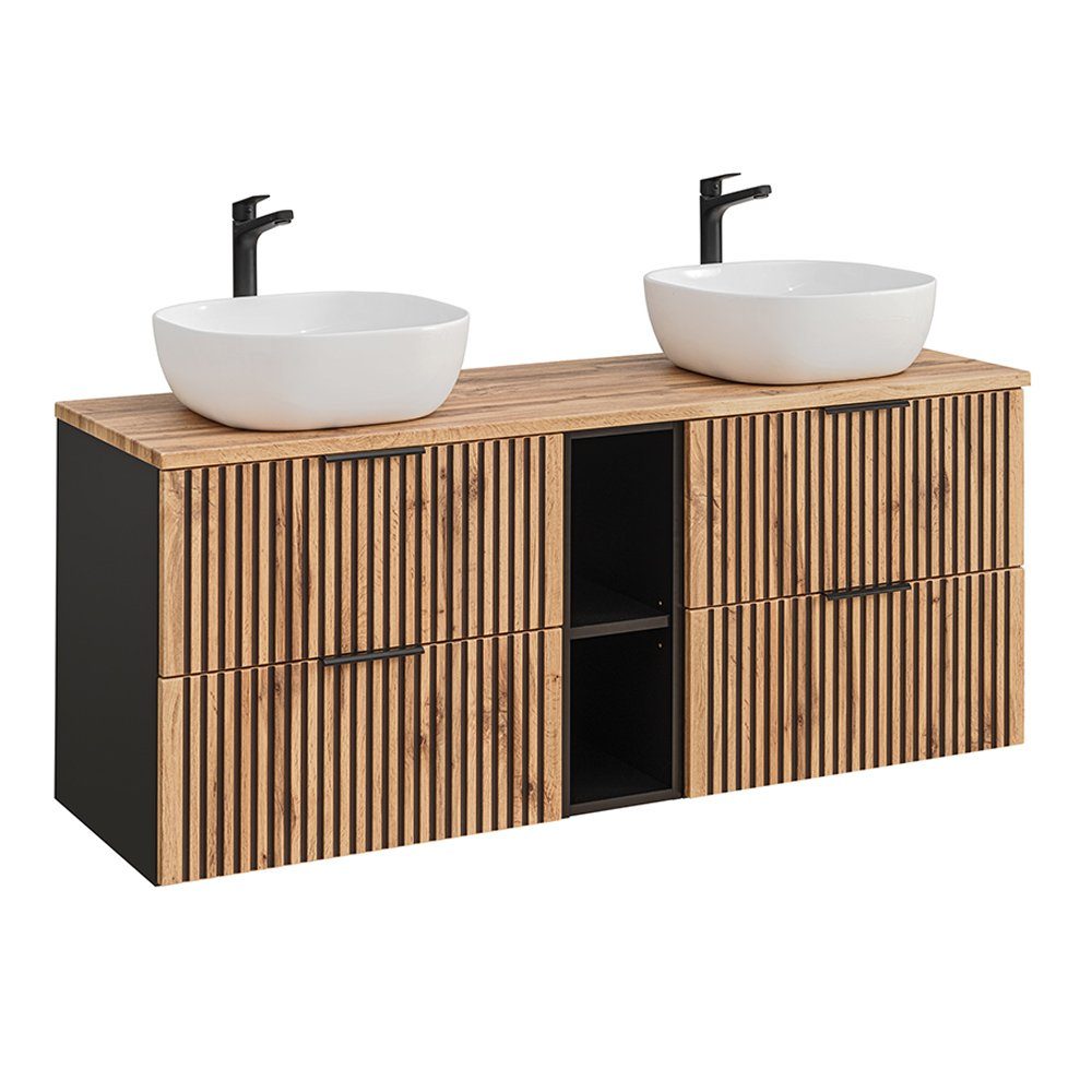 Setze mit unserer Serie XANTEN-56 dein Badezimmer in Szene. Die aufwändig gearbeiteten Fronten in Wotaneiche Nb. mit schwarzen Rillen unterstreichen das ausdrucksstarke und moderne Design der Badmöbel. Anthrazitfarbene Korpen und schwarze Griffe ergänzen die besondere Optik. Verschiedene Waschtisch- und Waschbeckenkombinationen lassen keine Wünsche offen. Komfortable Softclose-Systeme und MDF-Fronten unterstreichen die hochwertige Verarbeitung.
