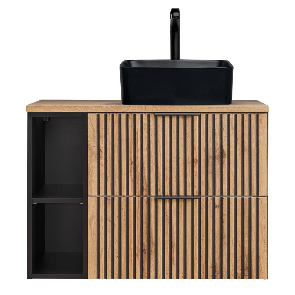 Setze mit unserer Serie XANTEN-56 dein Badezimmer in Szene. Die aufwändig gearbeiteten Fronten in Wotaneiche Nb. mit schwarzen Rillen unterstreichen das ausdrucksstarke und moderne Design der Badmöbel. Anthrazitfarbene Korpen und schwarze Griffe ergänzen die besondere Optik. Verschiedene Waschtisch- und Waschbeckenkombinationen lassen keine Wünsche offen. Komfortable Softclose-Systeme und MDF-Fronten unterstreichen die hochwertige Verarbeitung.