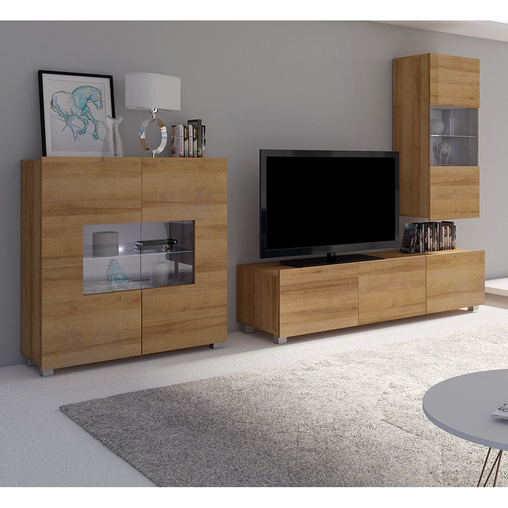 Drei verschiedene Dekore - Eiche Gold Nb., schwarz Hochglanz und weiß Hochglanz - bieten hierbei zahllose individuelle Kombinationsmöglichkeiten. Glaselemente und LED-Beleuchtung sorgen dabei für einen modernen Look.