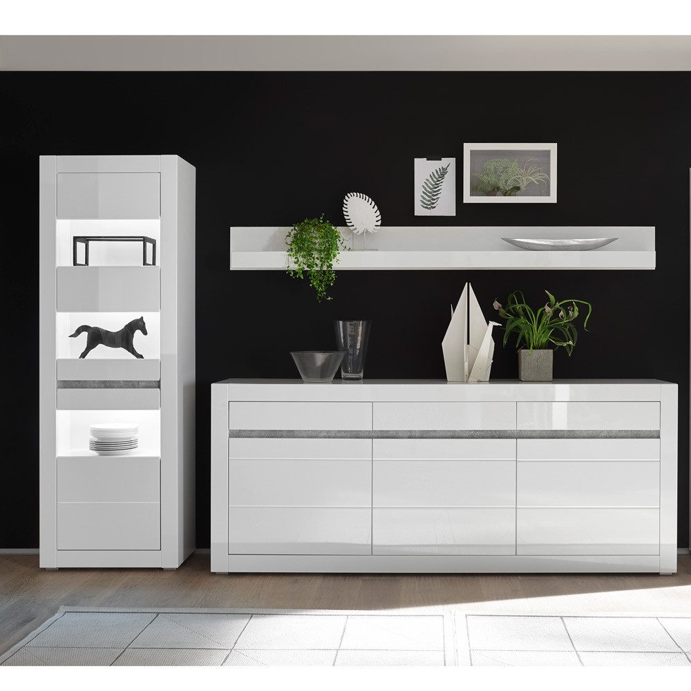 Mit dieser ultra modernen Wohnzimmer-Möbel-Serie COGO-61 mit Fronten in weiß Hochglanz und einmaligen Griffmulden / Zierleisten in Betonoptik liegen Sie im Trend und verleihen Ihrer Wohnung ein elegantes Erscheinungsbild. Die Oberflächen sind pflegeleicht, die Möbel bieten viel Stauraum und Türen als auch Schubladen sind mit Soft-Close-System ausgestattet.