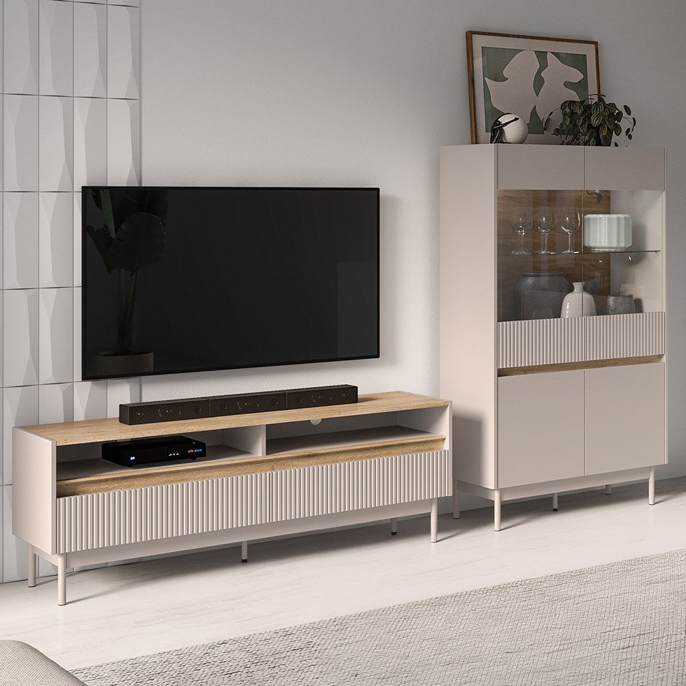 Diese moderne Wohnwand in kaschmir matt mit Akzenten in Eiche-Dekor und feiner Rillenoptik bringt Ruhe sowie Eleganz in dein Wohnzimmer. Das Set besteht aus einem Lowboard mit zwei offenen Fächern und zwei Schubladen mit Vollauszug sowie einem Highboard mit Glaseinlegeboden und LED-Unterbauspots für stimmungsvolle Lichtakzente. Griffloses Design, Softclose-Türen, pflegeleichte Oberflächen und elegante Metallfüße runden das Gesamtbild funktional ab.