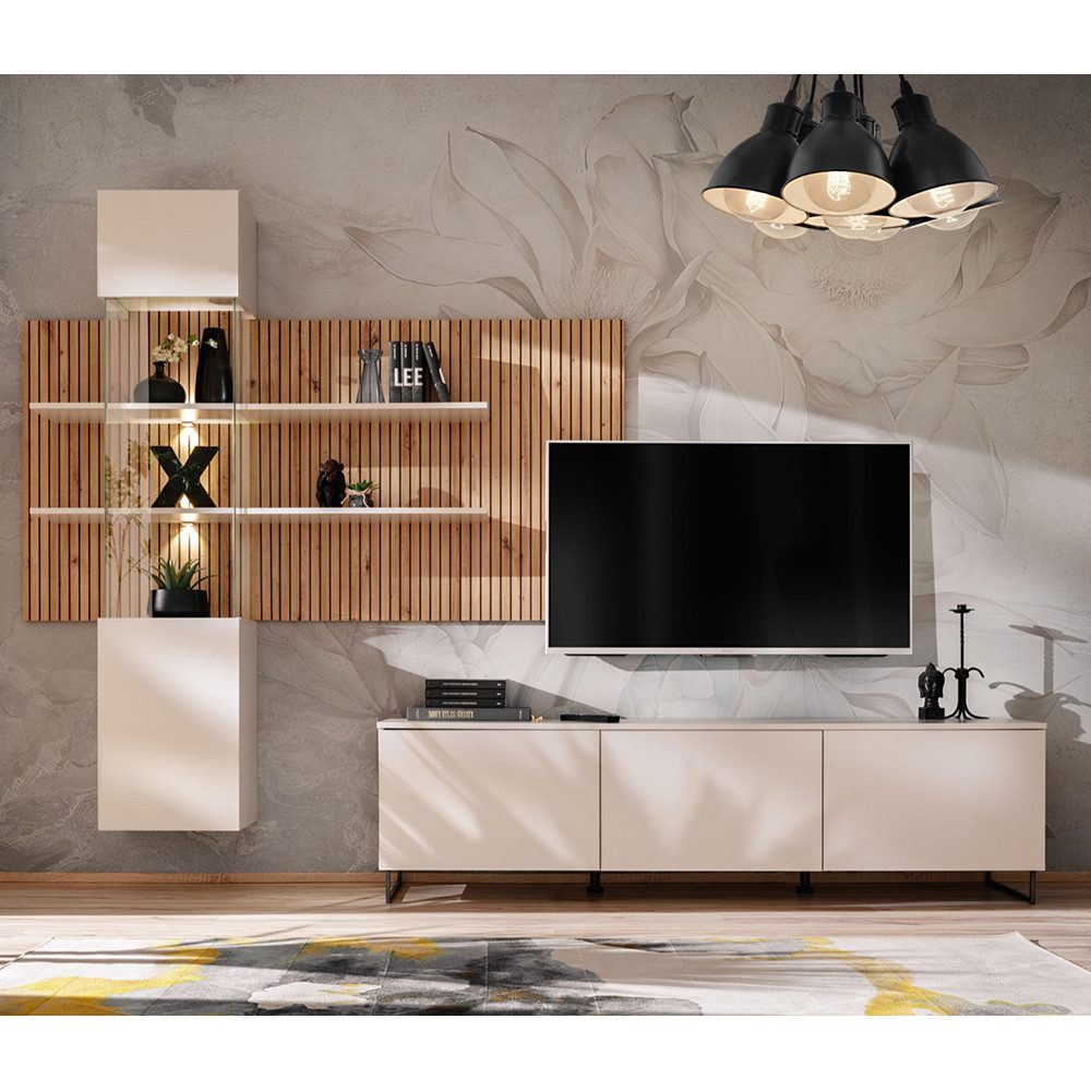 Verleihe deinem Wohnzimmer einen Hauch von Eleganz mit unserer Wohnwandserie in Kaschmir und Artisan Eiche, akzentuiert durch schwarze Streifen.