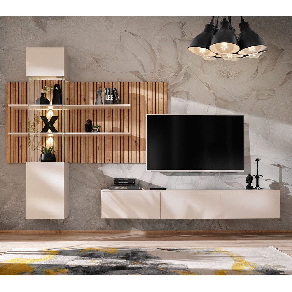 Verleihe deinem Wohnzimmer einen Hauch von Eleganz mit unserer Wohnwandserie in Kaschmir und Artisan Eiche, akzentuiert durch schwarze Streifen.