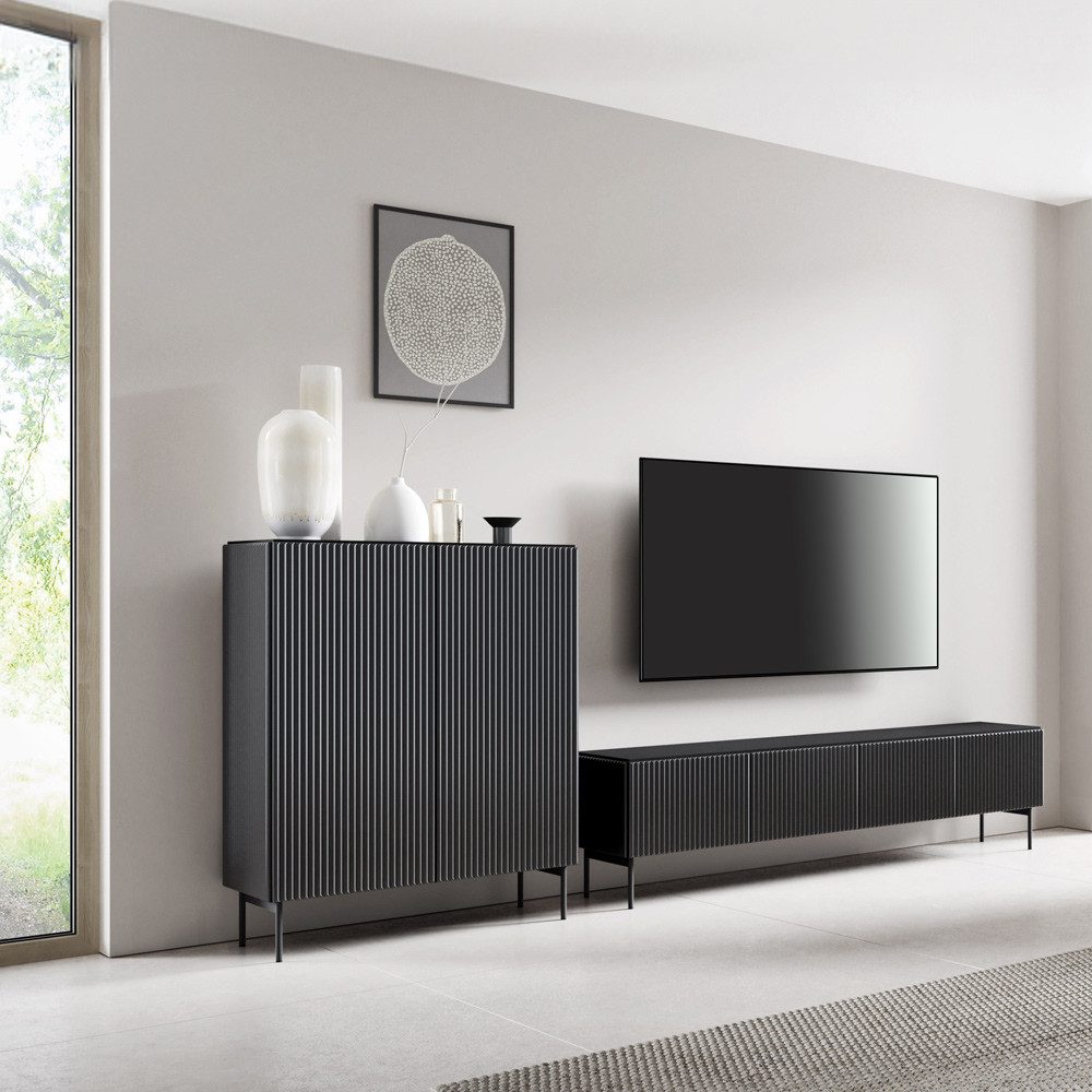 Mit dem Wohnprogramm MASSA-167 in Schwarz erhältst du ein modernes Set, das Stil und Funktion perfekt kombiniert. Das Lowboard bietet die ideale Basis für deine Multimedia-Geräte, während das Highboard mit viel Stauraum für Geschirr, Bücher oder Wohnaccessoires überzeugt. MDF-Fronten mit markanter Rillenoptik, robuste ABS-Kanten und elegante Metallfüße vereinen Design und Qualität.
