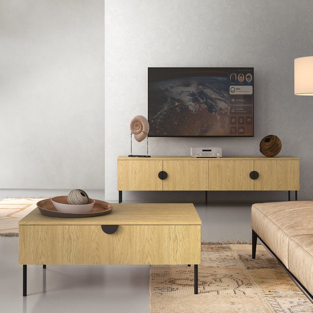 Erhältlich in warmem Eiche-Dekor oder elegantem Schwarz, passt diese Serie perfekt in moderne und klassische Wohnräume. Besonders herausstechend sind die runden Griffe, die wie ein Halbmond an den Fronten erscheinen und den Möbeln einen einzigartigen, charmanten Look verleihen. Die Schubladen sind mit einer Softclose-Funktion ausgestattet, um sanftes und geräuschloses Спрятать zu ermöglichen. Diese Serie kombiniert Stil und Komfort, um deinem Zuhause einen luxuriösen, modernen Charakter zu verleihen.