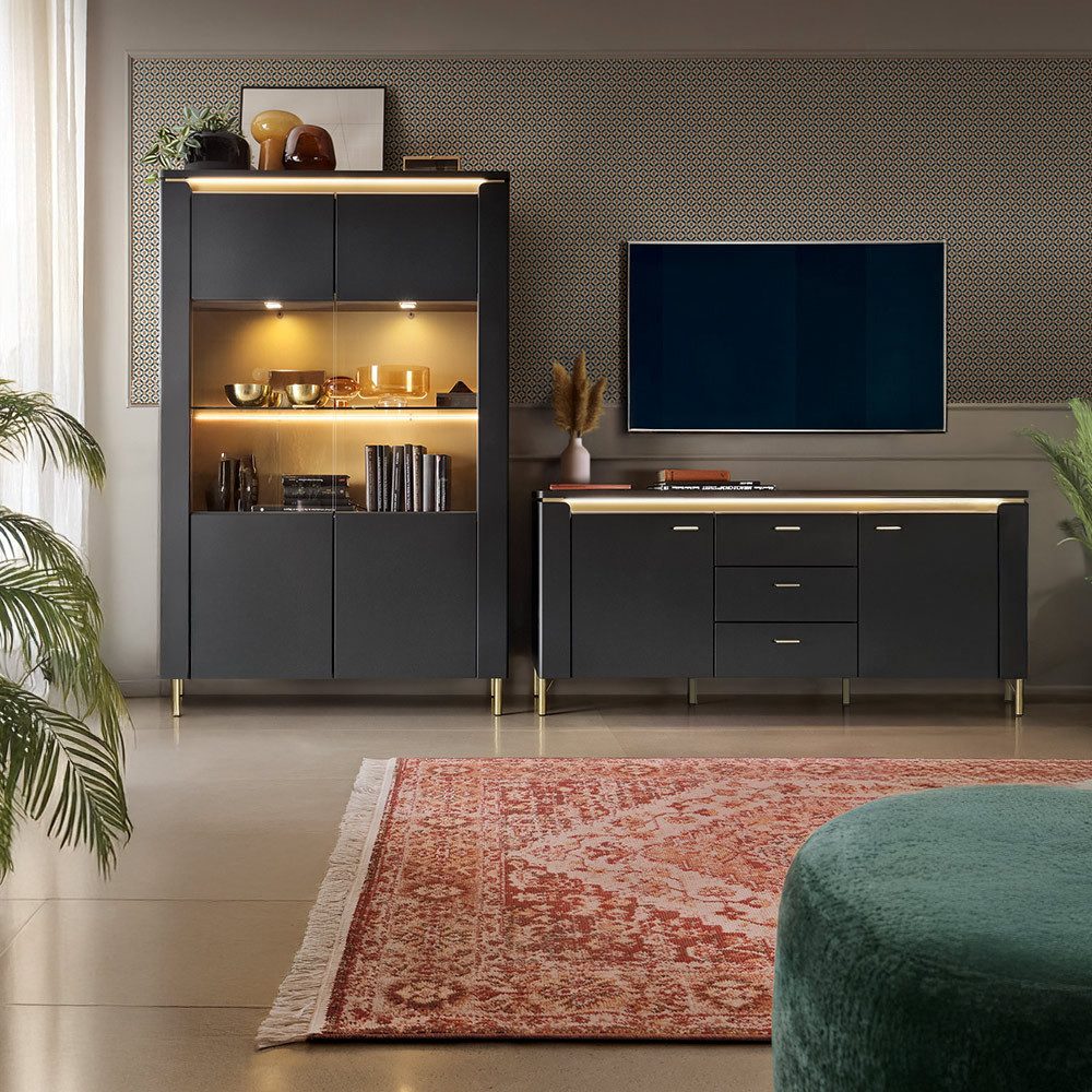 Diese 2-teilige Wohnwand in edlem Schwarz matt mit goldfarbenen Akzenten und integrierter Akzentbeleuchtung kombiniert modernes Design mit praktischer Funktionalität. Der Vitrinenschrank bietet stilvollen, beleuchteten Stauraum für Gläser, Geschirr oder dekorative Lieblingsstücke, während das Lowboard Platz für Technik, Zubehör und Dekoration schafft. Dank der widerstandsfähigen Melaminharzbeschichtung sind die Möbel unempfindlich gegenüber äußeren Einflüssen. Die Kombination aus hochwertigen Materialien und elegantem Look macht das Set zu einem stilvollen Highlight im Wohnzimmer – ideal für entspannte Abende, die Präsentation dekorativer Elemente oder ein aufgeräumtes Wohnambiente.