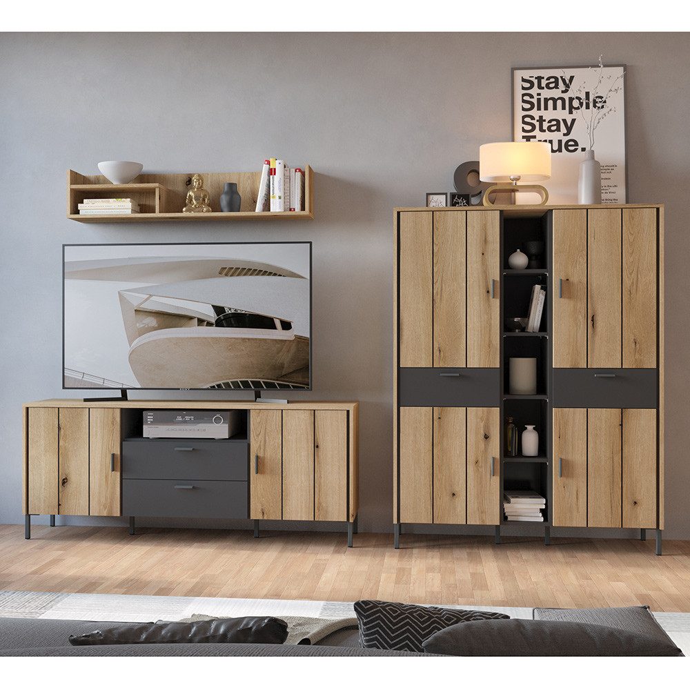 Modern, funktional und stilvoll: Diese Wohnwand im Eiche-Dekor mit anthrazitfarbenen Akzenten bringt natürlichen Charme und urbanen Look in dein Zuhause. Dezente Griffe, hohe Metallfüße und klare Linien sorgen für ein modernes Design mit Leichtigkeit.