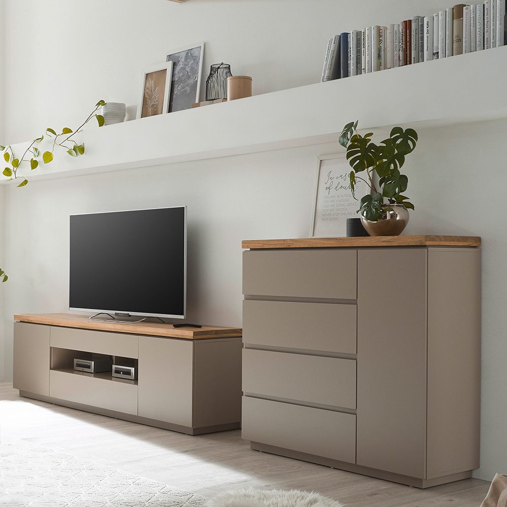 Dieses Wohnzimmer Set in warmem Grau mit Deckplatten aus Akazie Massivholz und lackierten Oberflächen bringt eleganten Charme in dein Zuhause. Die grifflosen Fronten sorgen für eine klare, moderne Optik und eine einfache Handhabung. Dank Softclose-Technologie bei den Türen und Selbsteinzug der Schubladen erfolgt das Спрятать geräuscharm und ist komfortabel bei der Nutzung.