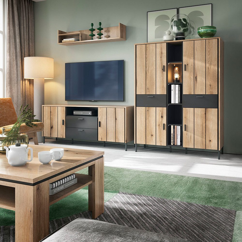 Dieses 4-teilige Wohnzimmer-Set kombiniert warmes Eiche-Dekor mit markanten anthrazitfarbenen Akzenten und schafft eine moderne, wohnliche Atmosphäre. Die Kombination aus natürlichen Tönen, minimalistischen Griffen und filigranen Metallfüßen sorgt für eine zeitgemäße Optik, die perfekt zu Industrial-, Boho- oder modernen Wohnstilen passt.