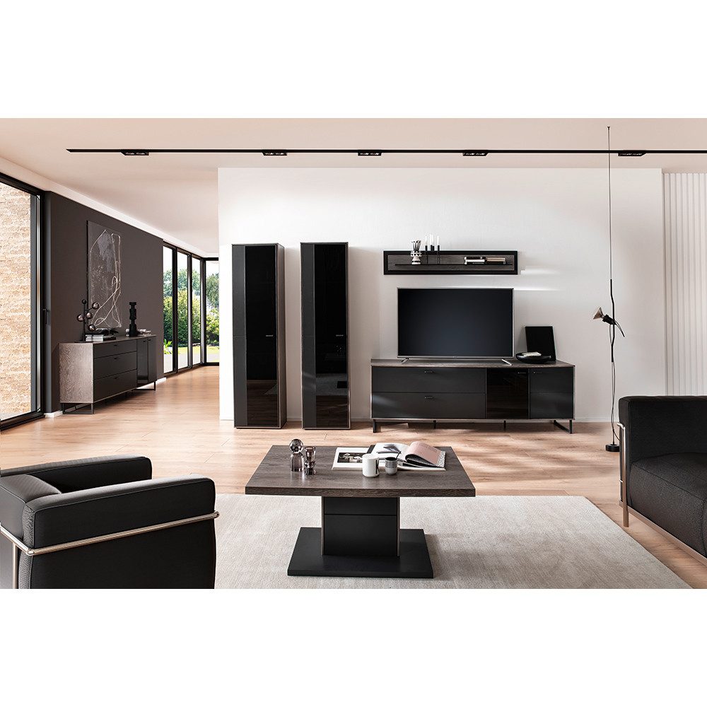 Die lackierten Softblack-Fronten verleihen den Möbeln eine elegante Oberfläche, die sich perfekt in jedes Ambiente einfügt. Der Korpus aus hochwertig furnierter Vulcano Eiche bringt eine natürliche Wärme in dein Zuhause, die den minimalistischen Stil der Serie harmonisch abrundet.