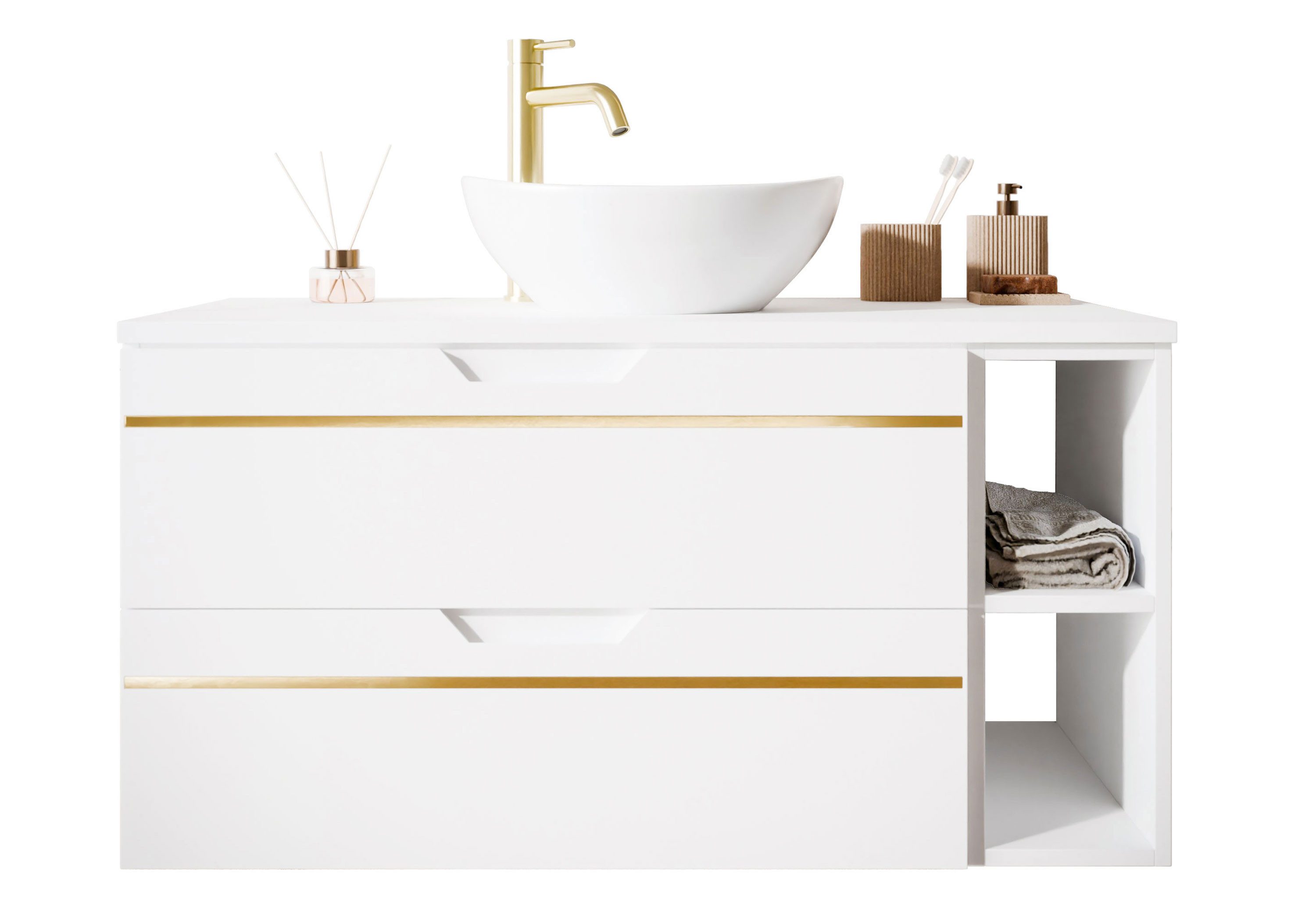 Zum Set gehört ein hängender Waschtischunterschrank mit einem Soft-Close-System für mehr Komfort im Alltag sowie ein offenes Regal zur praktischen Aufbewahrung wichtiger Utensilien. Ergänzt wird das Set durch eine robuste Arbeitsplatte aus hochwertiger MDF-Platte. Das minimalistische Design und die elegante Verarbeitung lassen das Regal perfekt mit dem Schrank harmonieren und schaffen eine einheitliche und harmonische Komposition. Das zusätzliche Regal rundet das Set perfekt ab, bietet zusätzlichen Stauraum und verbindet Funktionalität mit Ästhetik.