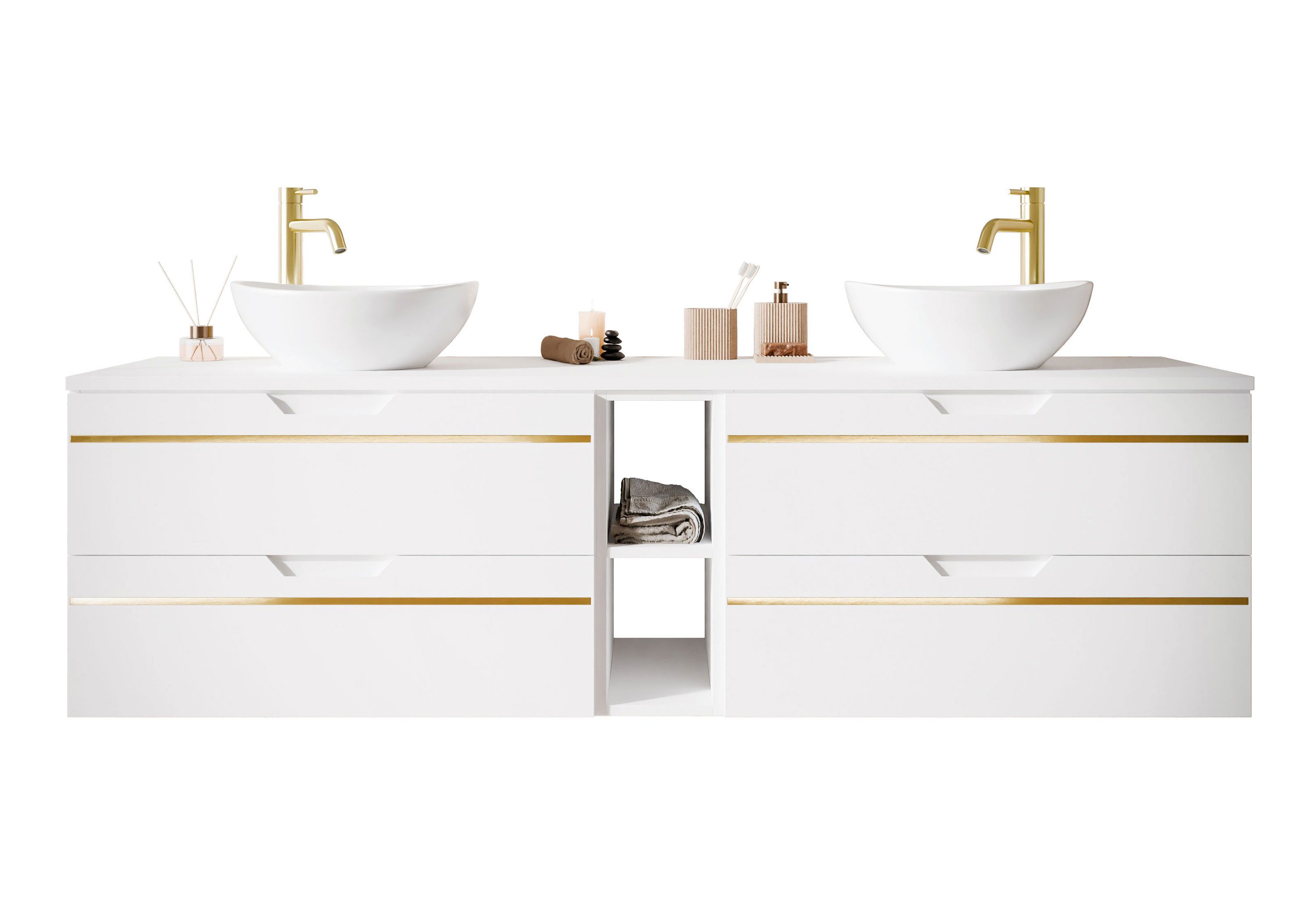 Das Set besteht aus zwei hängenden Badschränken mit Soft-Close-System für höchsten Komfort im Alltag sowie einem offenen Regal zur praktischen Aufbewahrung der wichtigsten Utensilien. Ergänzt wird das Set durch eine langlebige Arbeitsplatte aus hochwertiger MDF-Platte. Das minimalistische Design und die elegante Ausführung sorgen dafür, dass das Regal perfekt mit dem Schrank harmoniert und eine einheitliche und stimmige Komposition bildet.