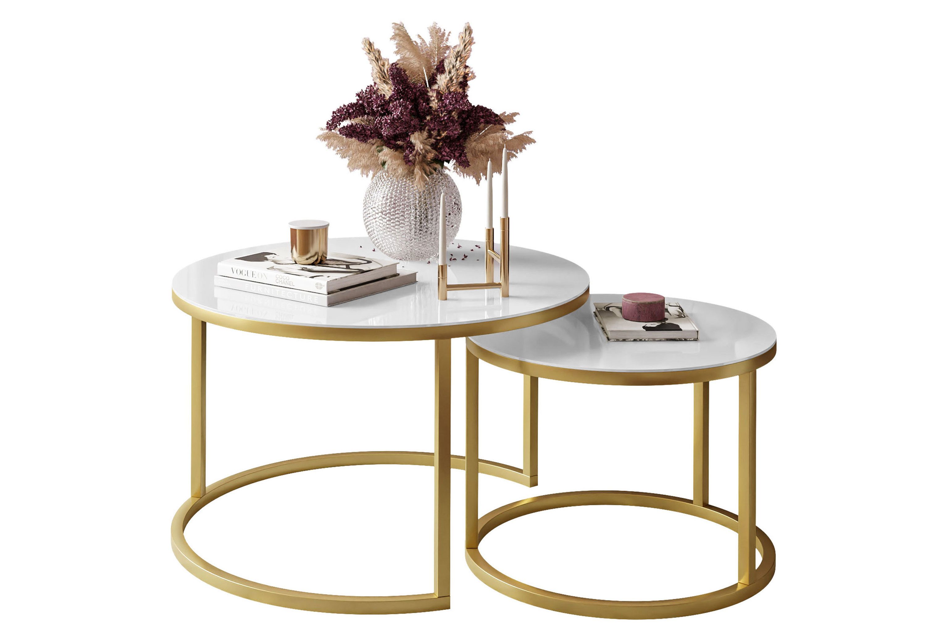 Die runde Tischplatte besteht vollständig aus hochglänzender MDF-Spannplatte und wird Sie nicht nur mit ihrer makellosen Schönheit, sondern auch mit ihrer guten Haltbarkeit und Schmutzbeständigkeit begeistern. Das Ganze ruht auf einer goldenen Metallbasis, die nicht nur für hohe Stabilität sorgt, sondern ihm auch ein modernes und elegantes Aussehen verleiht.