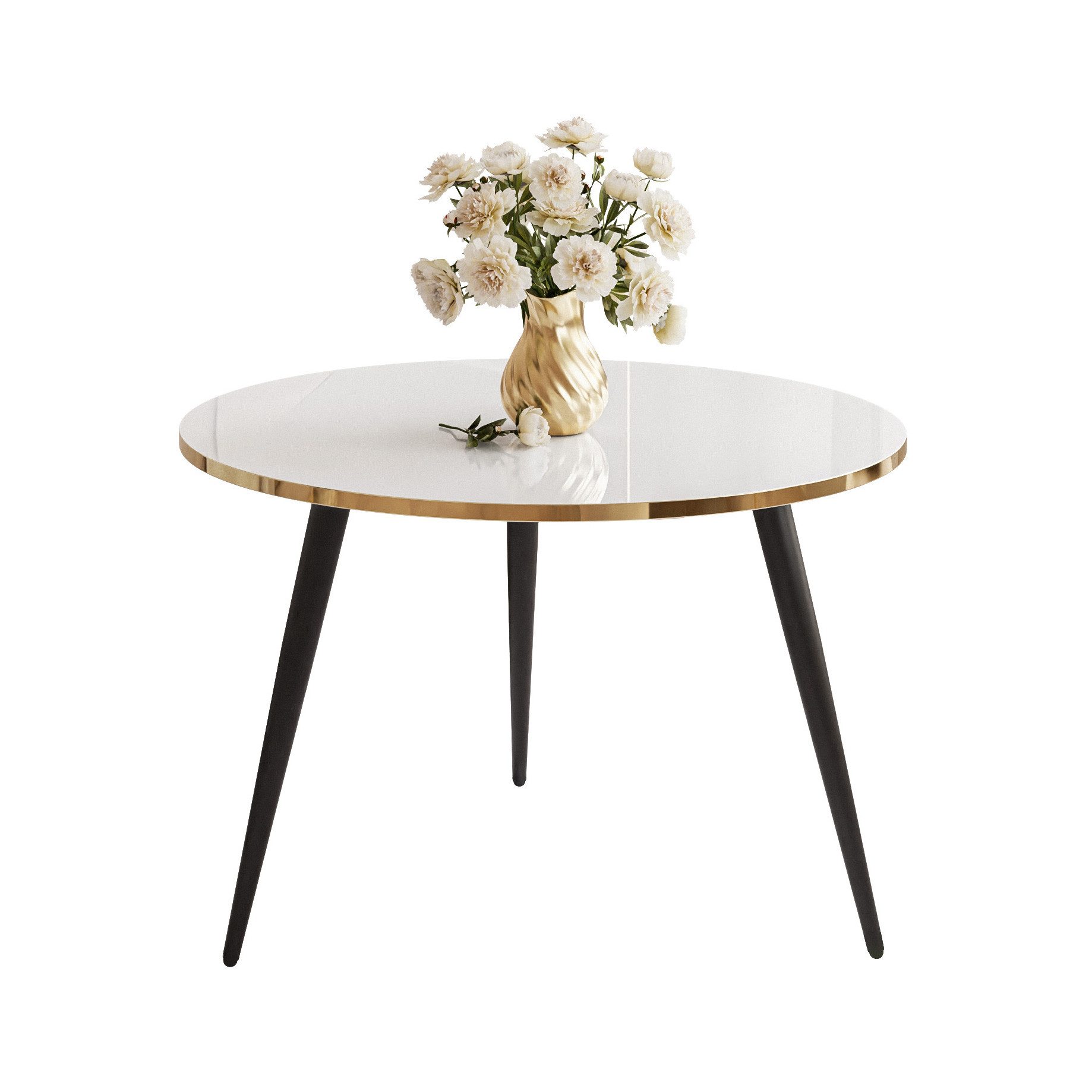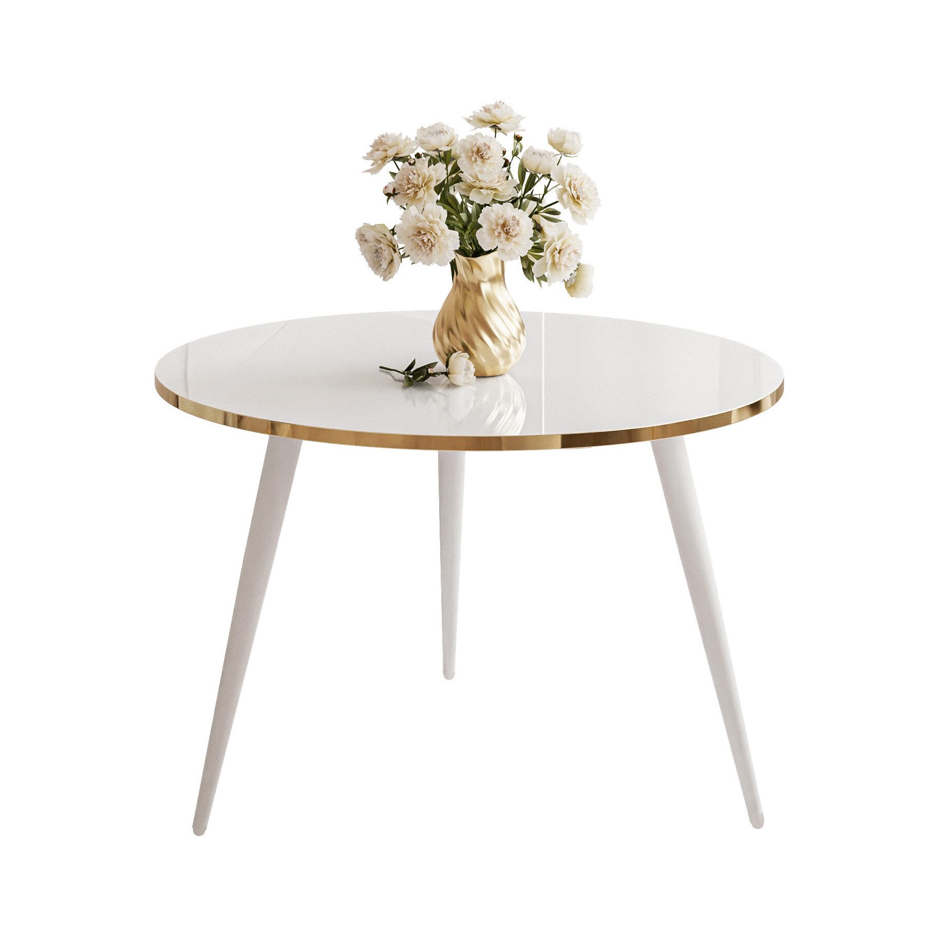 Die glänzende weiße Tischplatte ist ein Ausdruck von absoluter Eleganz. Die weiße Oberfläche verleiht dem Tisch Leichtigkeit und reflektiert das Licht, wodurch der Raum heller wirkt. Besonderes Highlight ist das goldene Tischplattenrand, das dem Tisch ein luxuriöses Aussehen verleiht und einen auffälligen Kontrast zum weißen Untergrund schafft.