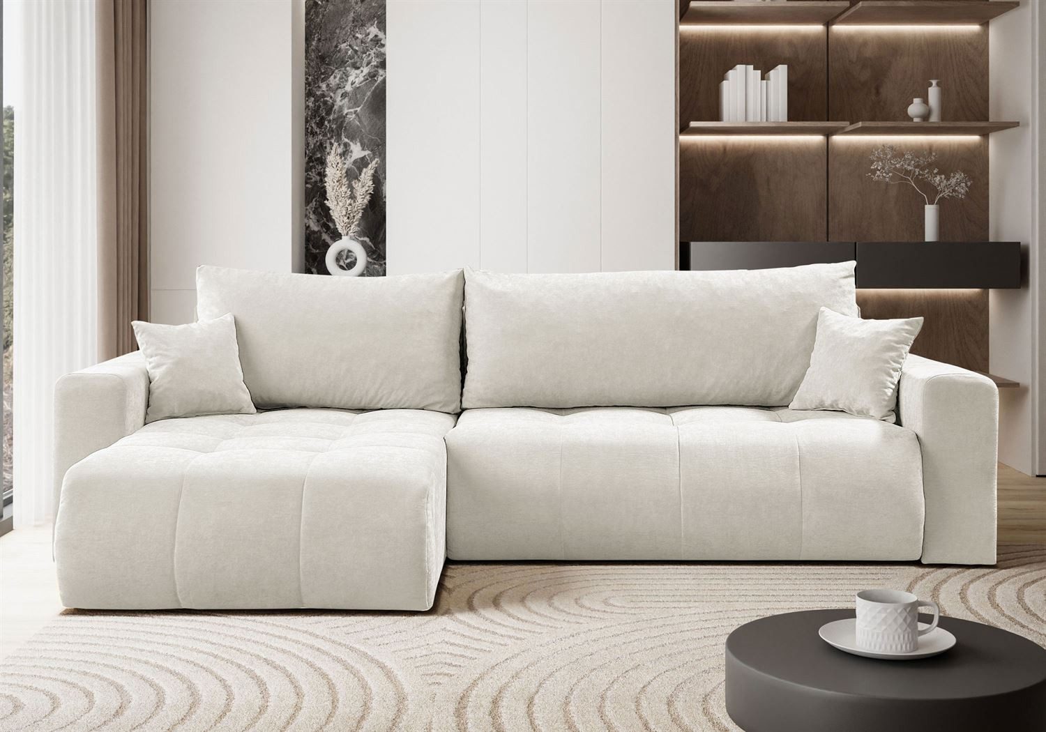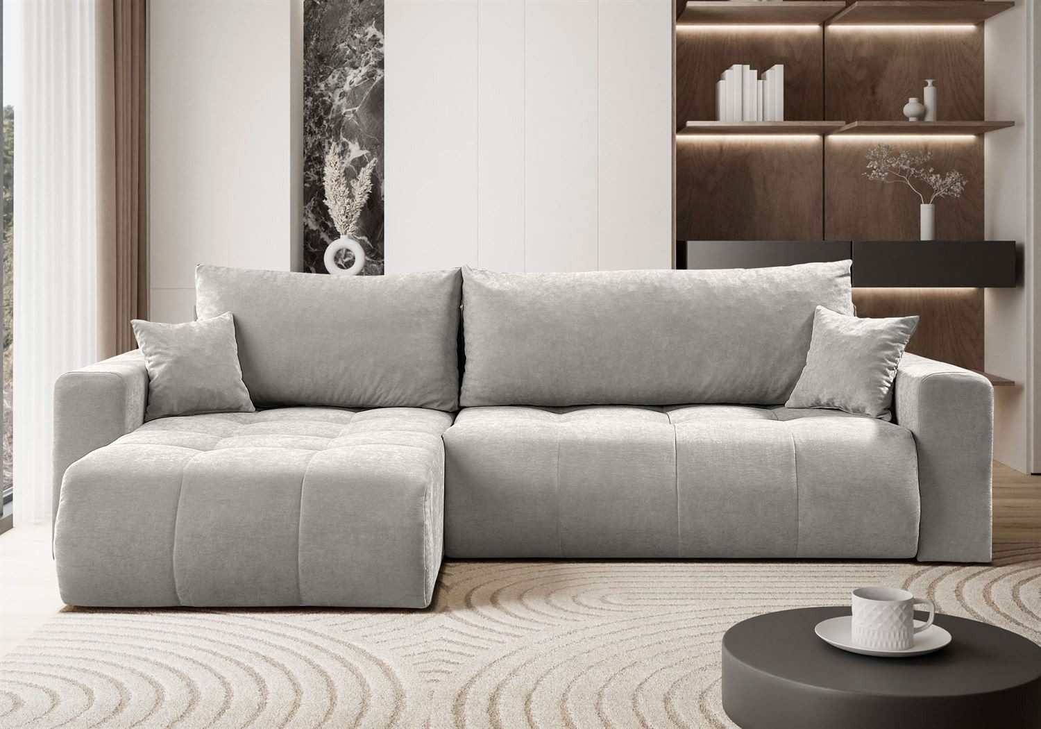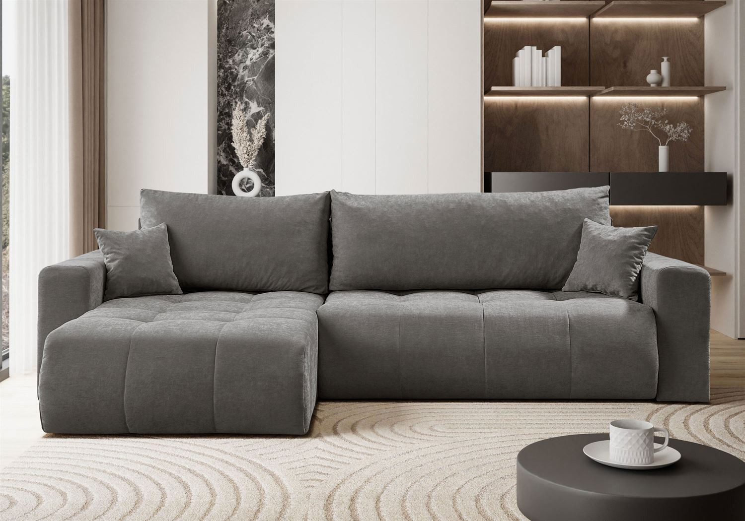 Ein zusätzlicher Vorteil dieses Ecksofas ist die Schlaffunktion, die es Ihnen ermöglicht, das Möbelstück schnell in ein bequemes Bett zu verwandeln, so dass Sie auch in einem begrenzten Raum bedenkenlos Gäste empfangen können. Darüber hinaus ist das Ecksofa mit einem geräumigen Stauraum für Bettwäsche ausgestattet, der dazu beiträgt, Ihr Wohnzimmer aufgeräumt zu halten. Dank der gepolsterten Rückenlehne sieht das Ecksofa von allen Seiten attraktiv aus und fügt sich so perfekt in jede Inneneinrichtung ein.