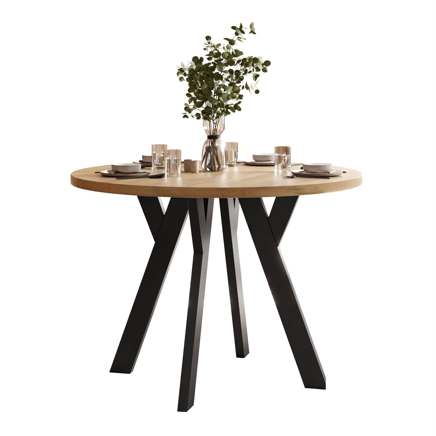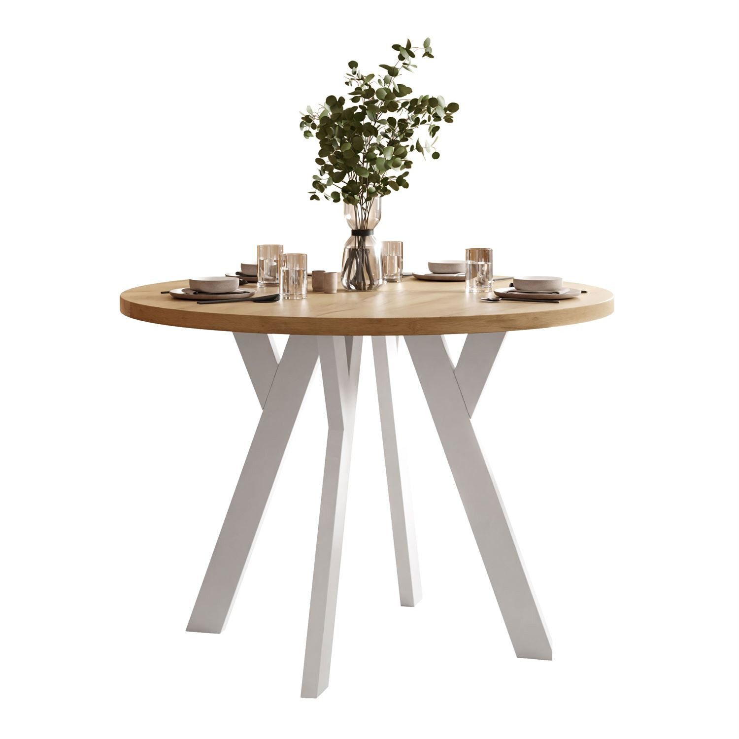 Die runde Tischplatte in zwei zeitlosen Farbvarianten besteht vollständig aus hochwertiger, 32 mm starker laminierter Platte. Dieses Material ist langlebig, pflegeleicht, widerstandsfähig gegen Beschädigungen und einfach zu reinigen. Sie müssen sich keine Sorgen über Flecken oder Kratzer machen – Ihr Tisch wird über viele Jahre hinweg hervorragend aussehen. Die Tischbeine bestehen aus pulverbeschichtetem Metall, was für langanhaltende Stabilität sorgt.