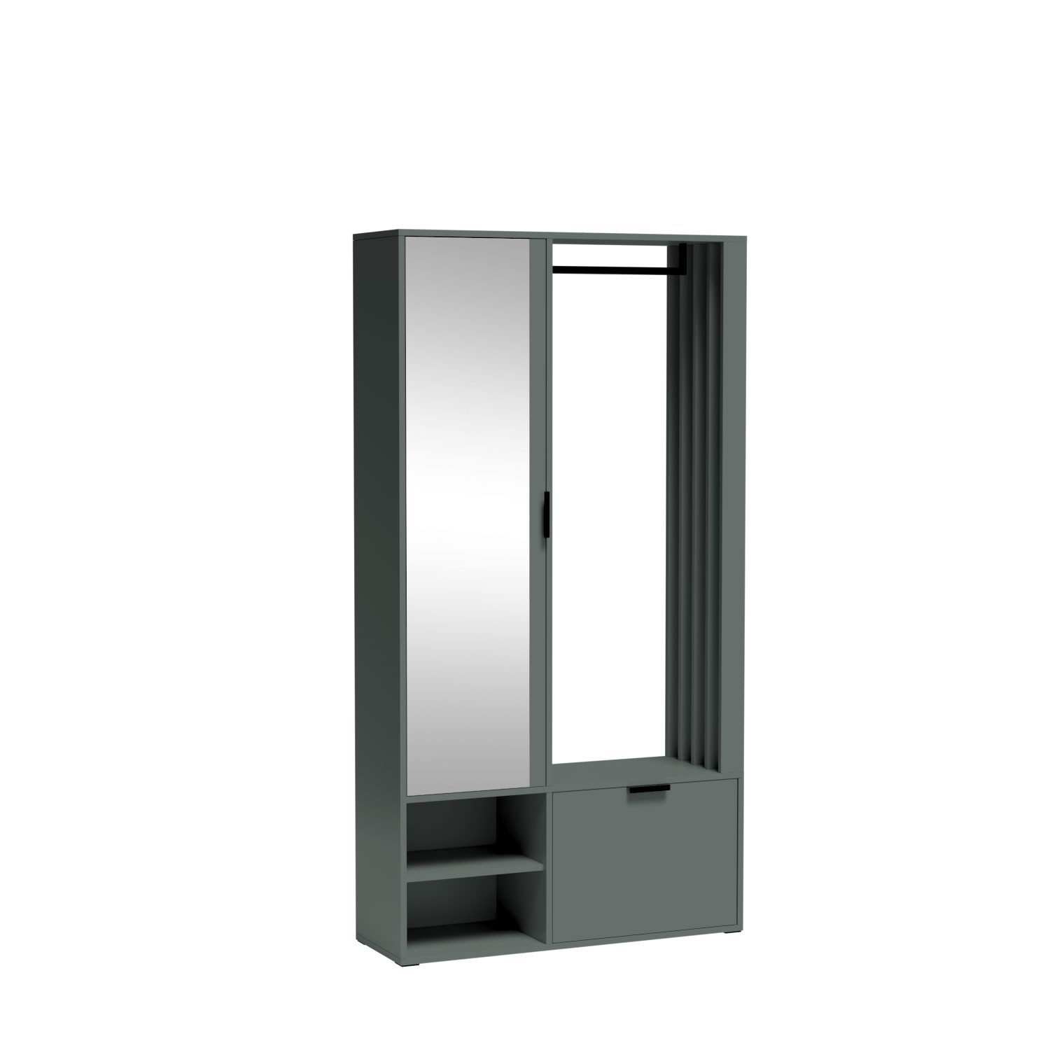 Das moderne Design des Kleiderschranks Foris passt sich den aktuellen Einrichtungstrends an. Hinter den Spiegeltüren befinden sich Regale, die für die Aufbewahrung von Schuhen für die ganze Familie genutzt werden können. Der Schrank ist in drei Farbvarianten erhältlich: Kaschmir, Stone Green und Graphit, was es ermöglicht, das Möbelstück an individuelle Vorlieben und den Stil des Interieurs anzupassen.