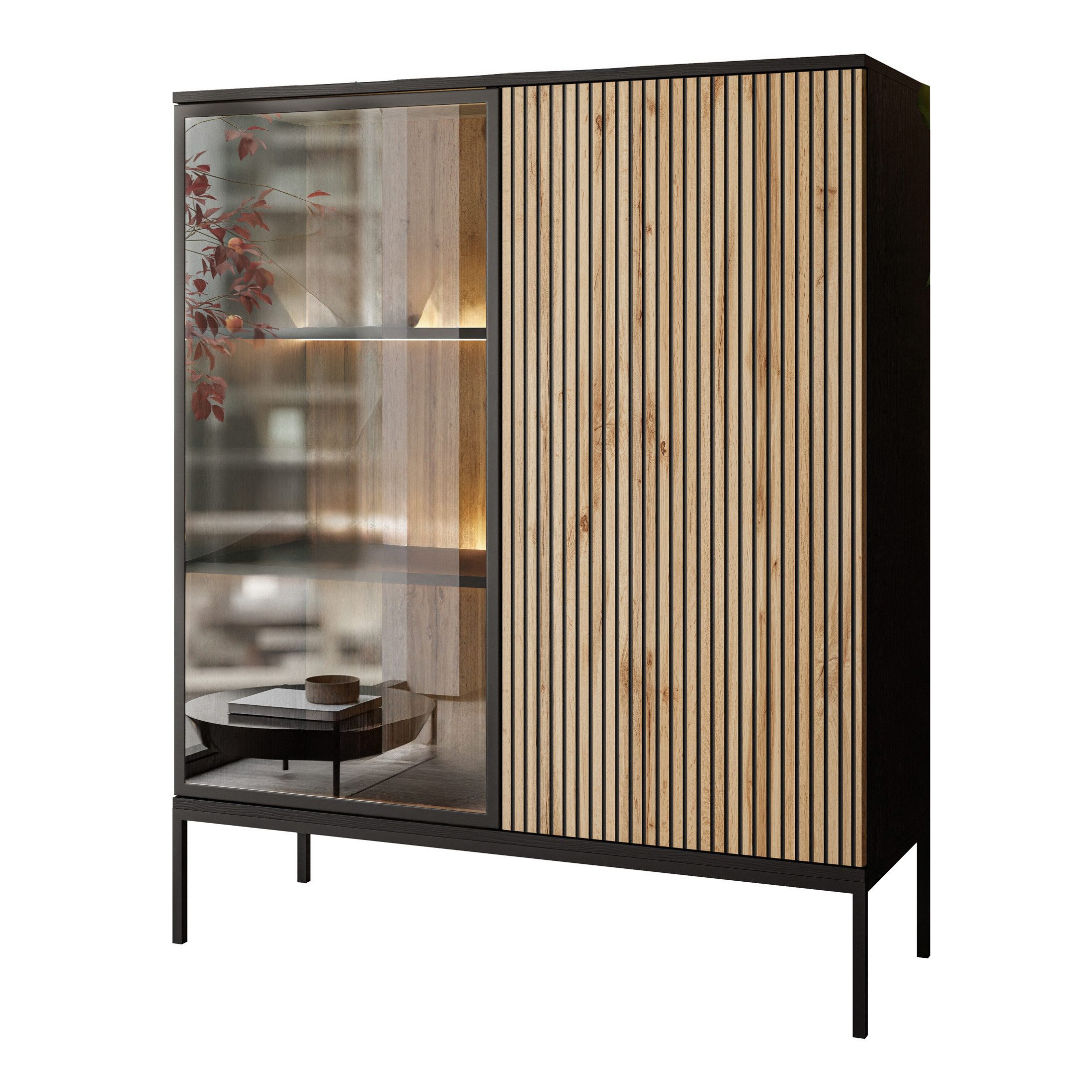 Der Innenraum ist in zwei geräumige Fächer mit Einlegeböden unterteilt, die die Rolle der praktischen Aufbewahrung und Präsentation Ihrer Gegenstände perfekt erfüllen werden. Eine der Fronten im Farbton Eiche Wotan strahlt die natürliche Wärme des Holzes aus, während die andere aus gehärtetem Glas gefertigt wurde, was der Kollektion Leichtigkeit und einen modernen Charakter verleiht. Der Korpus der Möbel ist in einem tiefen Schwarzton gehalten, der einen hervorragenden Kontrast zu den Fronten bildet und der gesamten Komposition einen einzigartigen Charakter verleiht.