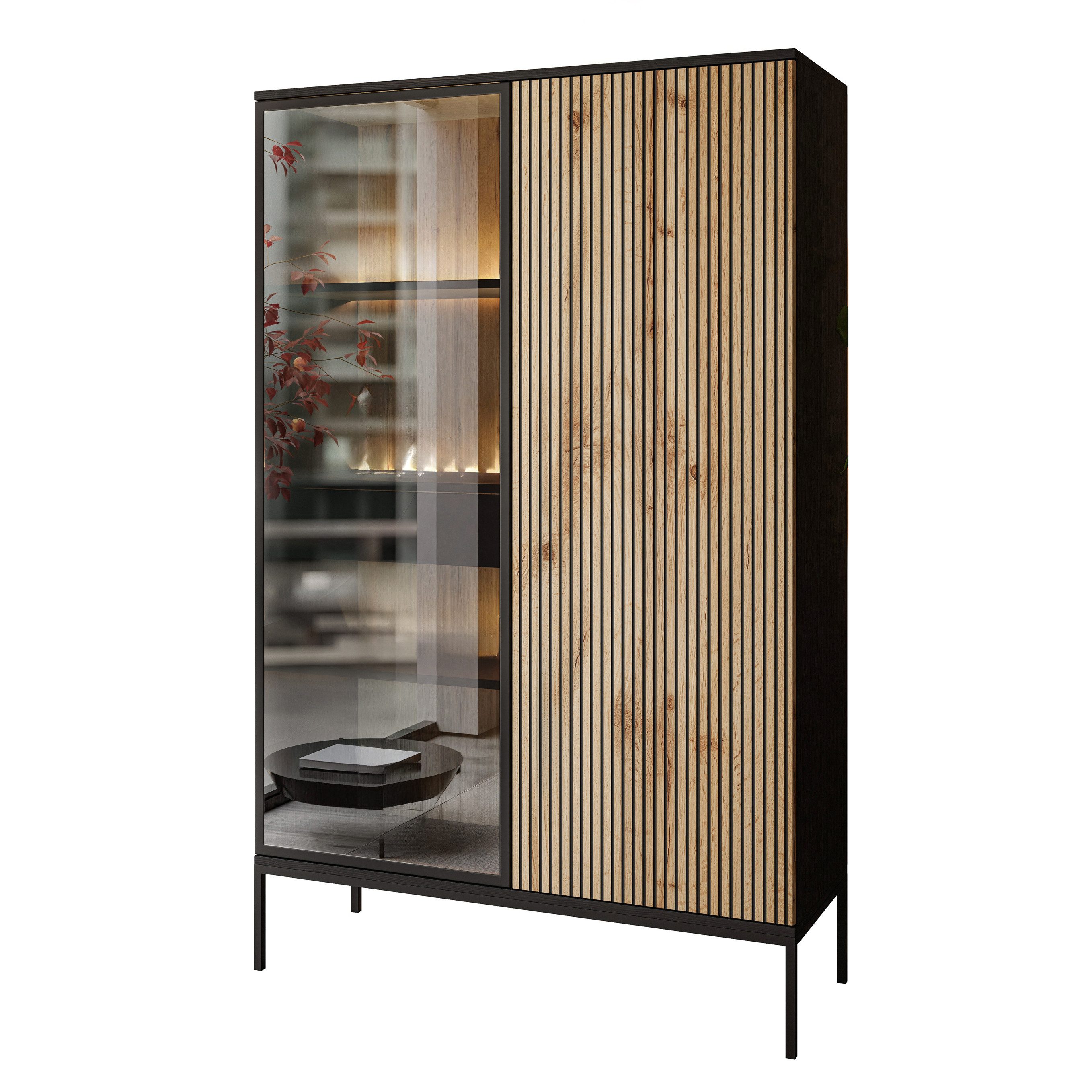 Der Innenraum ist in zwei geräumige Fächer mit Einlegeböden unterteilt, die die Rolle der praktischen Aufbewahrung und Präsentation Ihrer Gegenstände perfekt erfüllen werden. Eine der Fronten im Farbton Eiche Wotan strahlt die natürliche Wärme des Holzes aus, während die andere aus gehärtetem Glas gefertigt wurde, was der Kollektion Leichtigkeit und einen modernen Charakter verleiht. Der Korpus der Möbel ist in einem tiefen Schwarzton gehalten, der einen hervorragenden Kontrast zu den Fronten bildet und der gesamten Komposition einen einzigartigen Charakter verleiht.