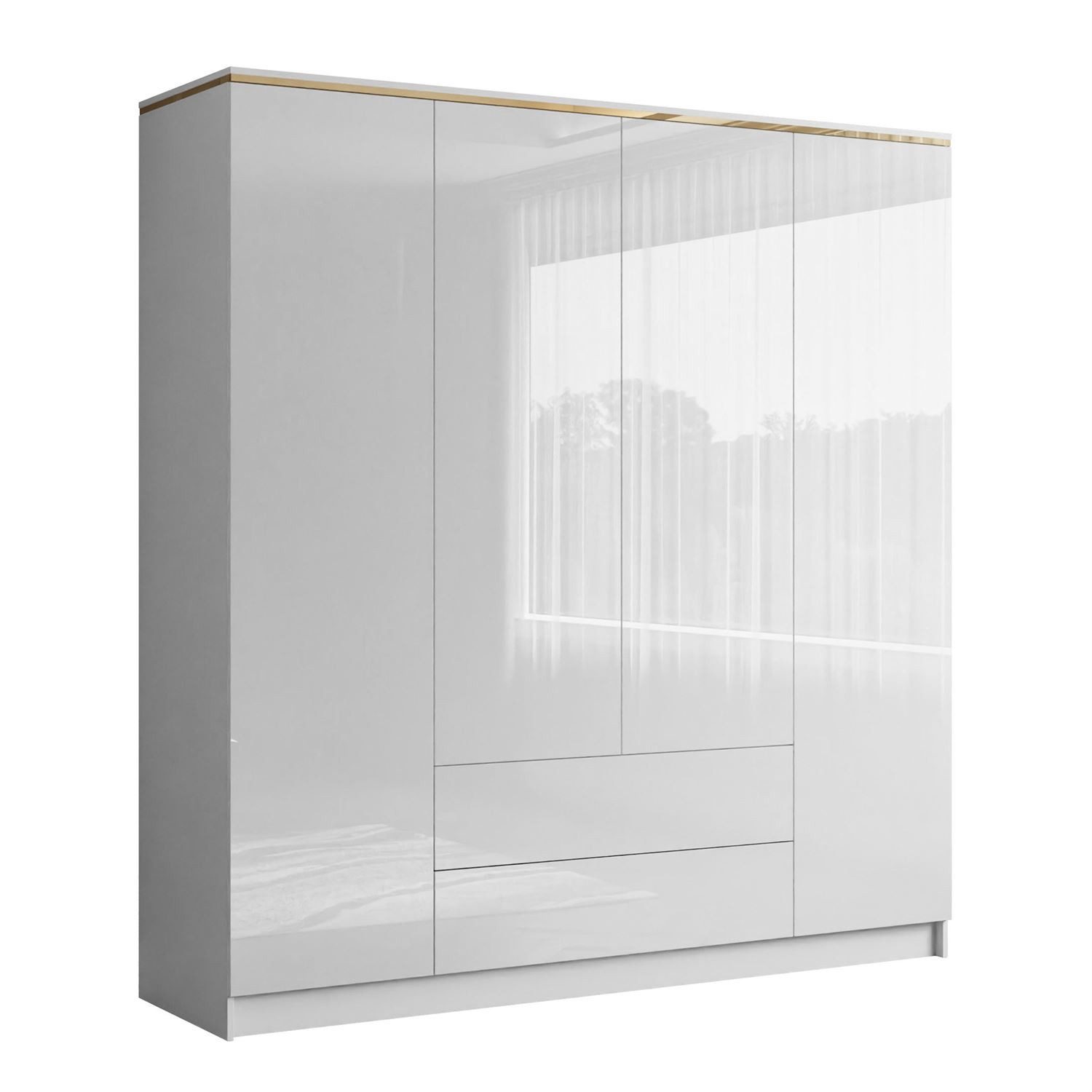 Das schneeweiße Finish ist eine elegante und moderne Option für die Möbelfertigung. Der weiße Glanz verleiht den Oberflächen einen subtilen Schimmer, der das Licht reflektiert und so ein Gefühl von Geräumigkeit und Frische schafft. Ideal für Räume, die Helligkeit und Klarheit benötigen und gleichzeitig einen Hauch von Luxus und Modernität einführen. Ein goldener Streifen fügt einen feinen Akzent hinzu, der das Auge anzieht und den exklusiven Charakter des Schranks unterstreicht. Zwei Spiegel ergänzen den Schrank und sind eine schöne Zierde des Interieurs sowie die beste Möglichkeit, einen kleinen Raum optisch zu vergrößern.