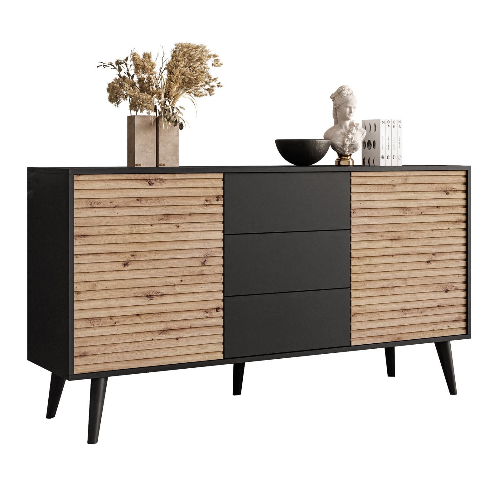 Die horizontalen Linien der kannelierten Fronten kontrastieren mit dem dunklen Korpus des Massivholzes, das auf schrägen und nach oben breiter werdenden Holzbeinen steht. All dies in sechs Feststoffe für den Einsatz im Wohnzimmer und darüber hinaus.