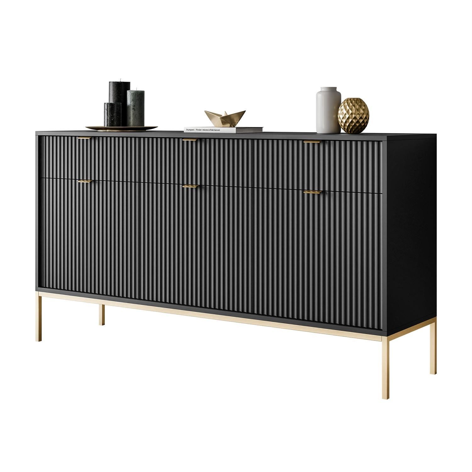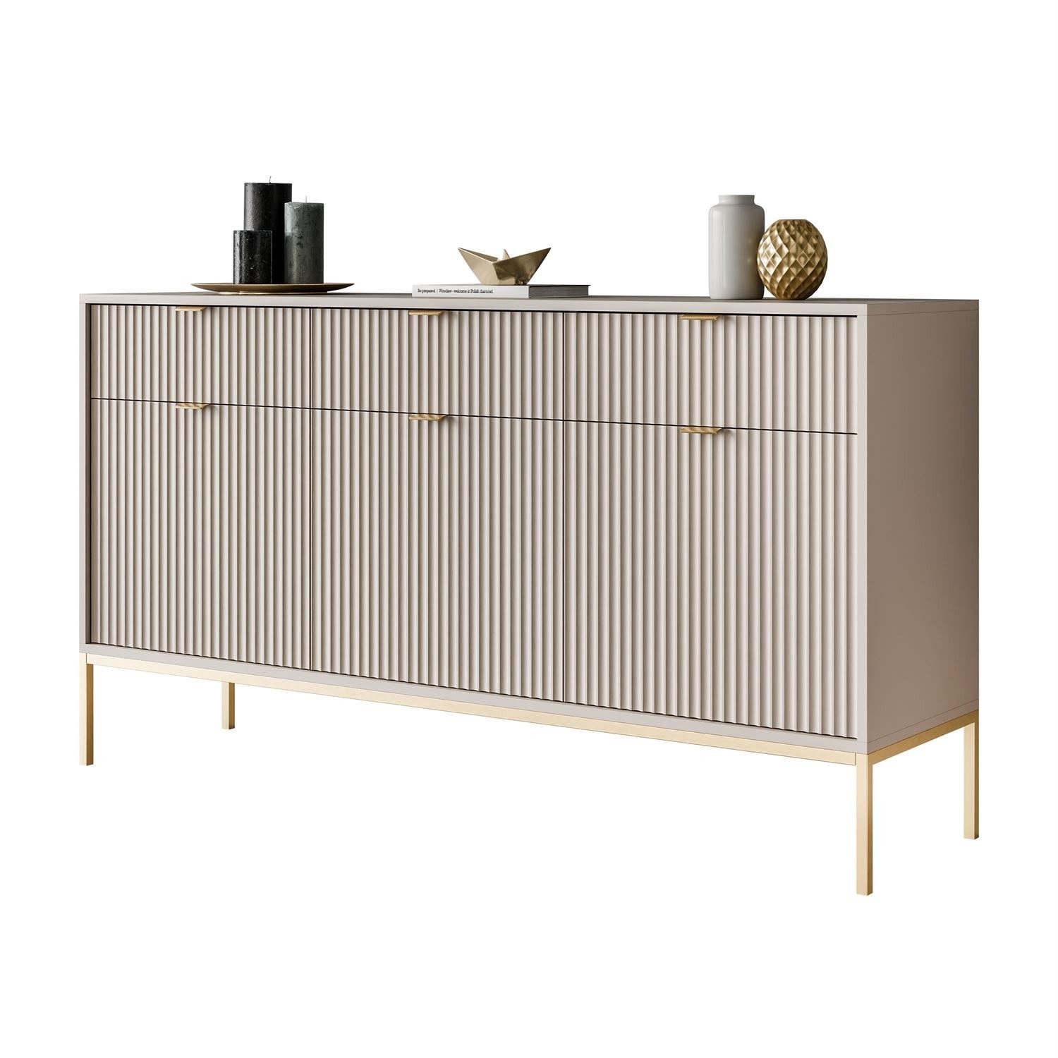 Die geriffelten Fronten verleihen dem Möbelstück Tiefe und Eleganz. Zusammen mit dem goldenen Metallgestell bekommt die Kommode einen modernen und luxuriösen Look.