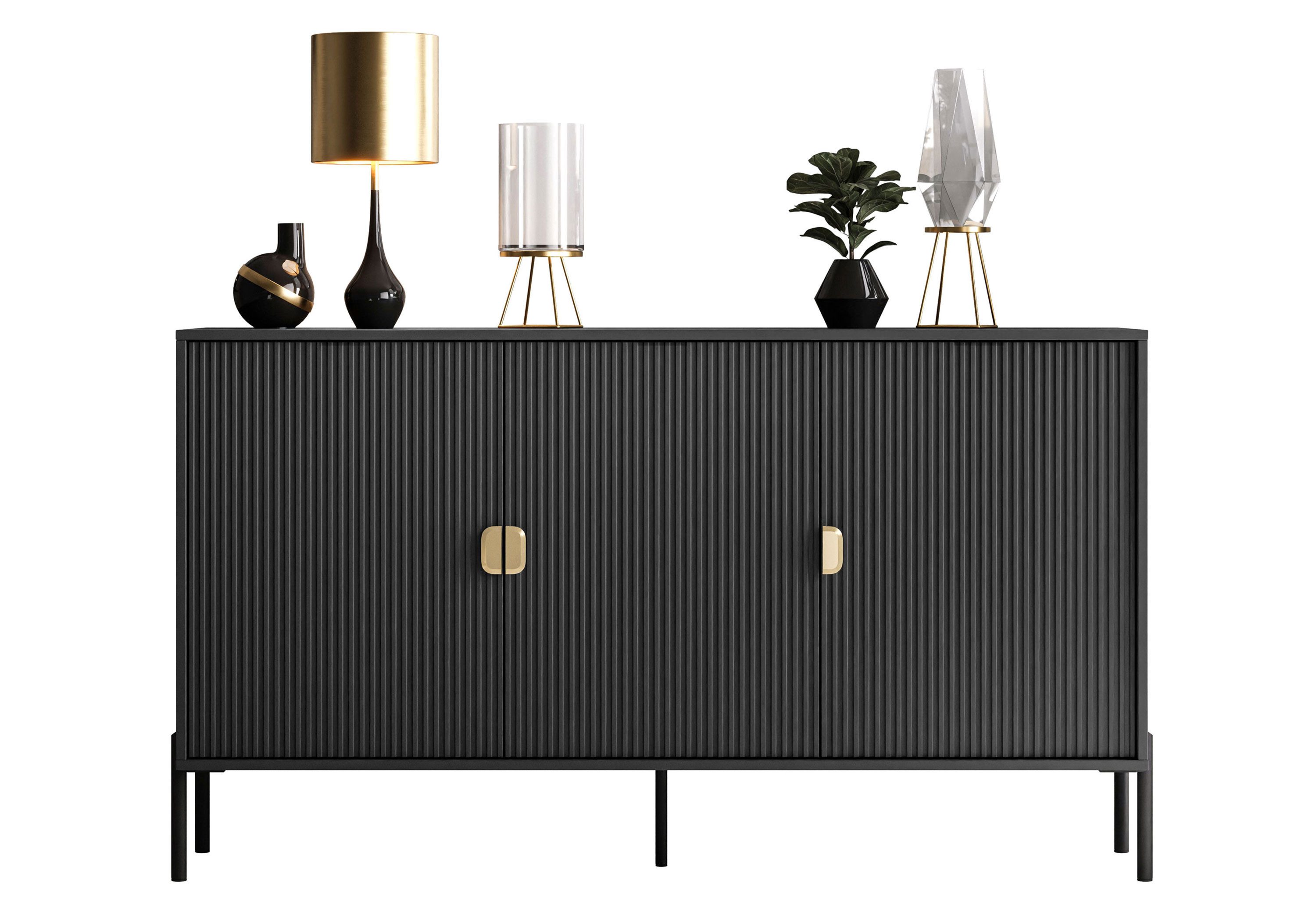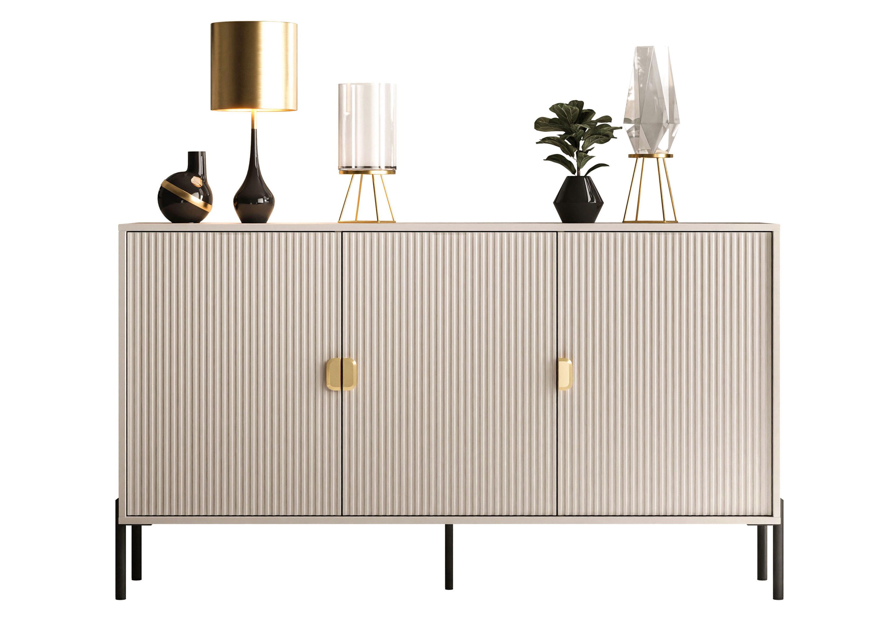 Die fein geriffelten Fronten verleihen dem Möbelstück eine einzigartige Optik, während die halbkreisförmigen Griffe in Gold einen dezenten Akzent setzen und die Modernität und Exklusivität des Möbels betonen.