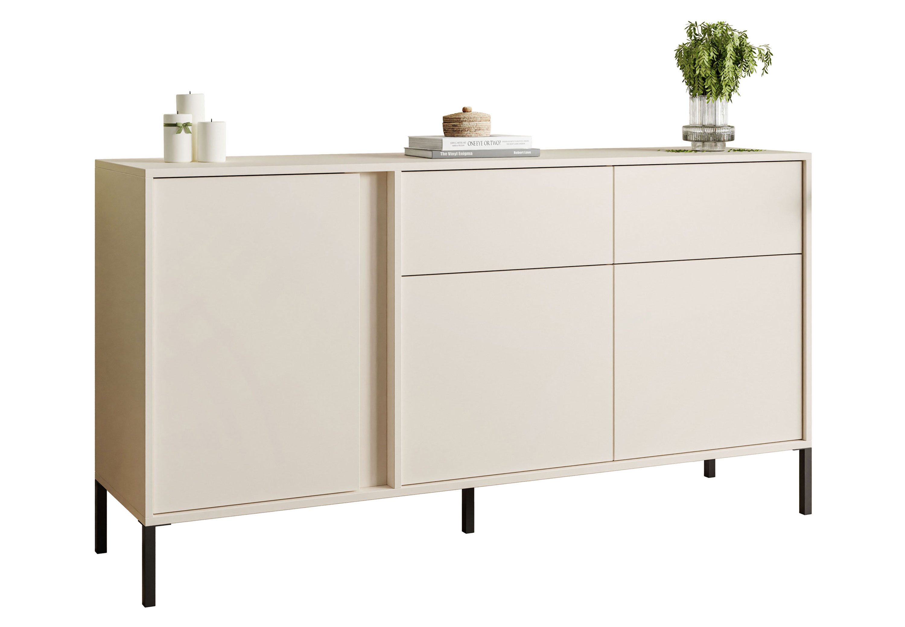 Funktionelle Kommode DELLE in Beige. Das grifflose Frontöffnungssystem macht traditionelle Griffe überflüssig und verleiht dem Möbel einen modernen Look.
