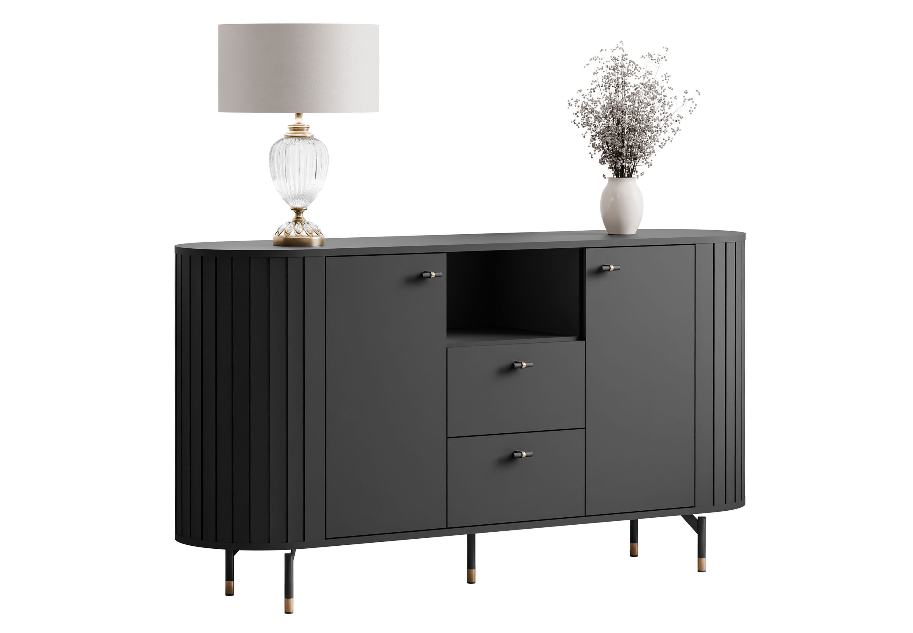 Die Kommode ELODIE ist ein modernes Möbelstück für das Wohnzimmer, das elegante gefräste Fronten, Metalldetails und ein Soft-Close-System vereint. Erhältlich in Schwarz und Kaschmir, bietet sie geräumige Schubladen, Regale sowie eine praktische Ausstellungsfläche – ideal zur Aufbewahrung und für Dekorationen.