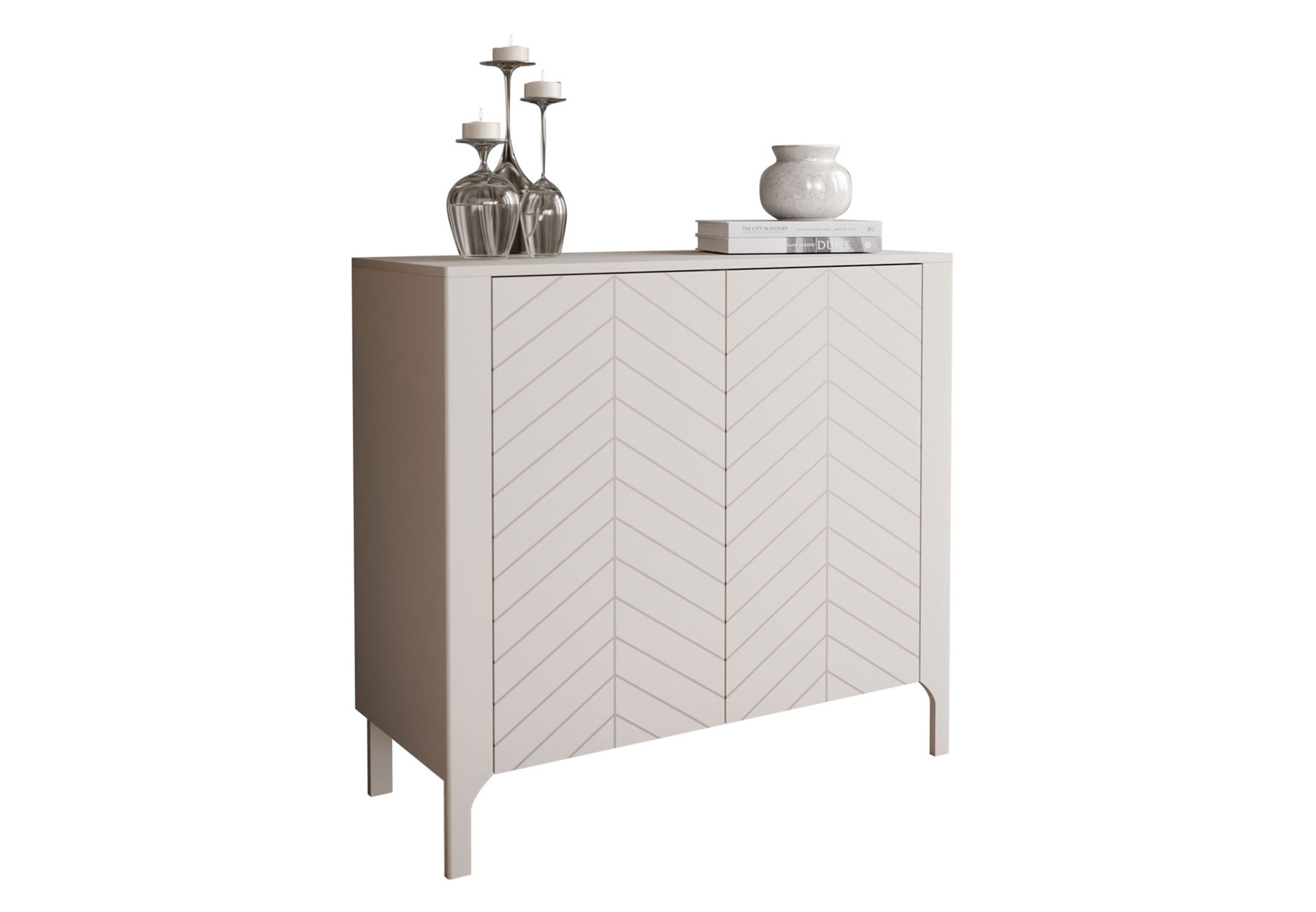 Ein besonderes Highlight setzen die Fronten mit dem edlen wzór w Fischgrätmuster, das sofort ins Auge fällt und dem Möbelstück einen einzigartigen, dekorativen Charakter verleiht. Das Öffnungssystem „Push-to-Open“ sorgt für glatte, grifflose Fronten, die das Möbel modern und elegant erscheinen lassen und stilvoll.