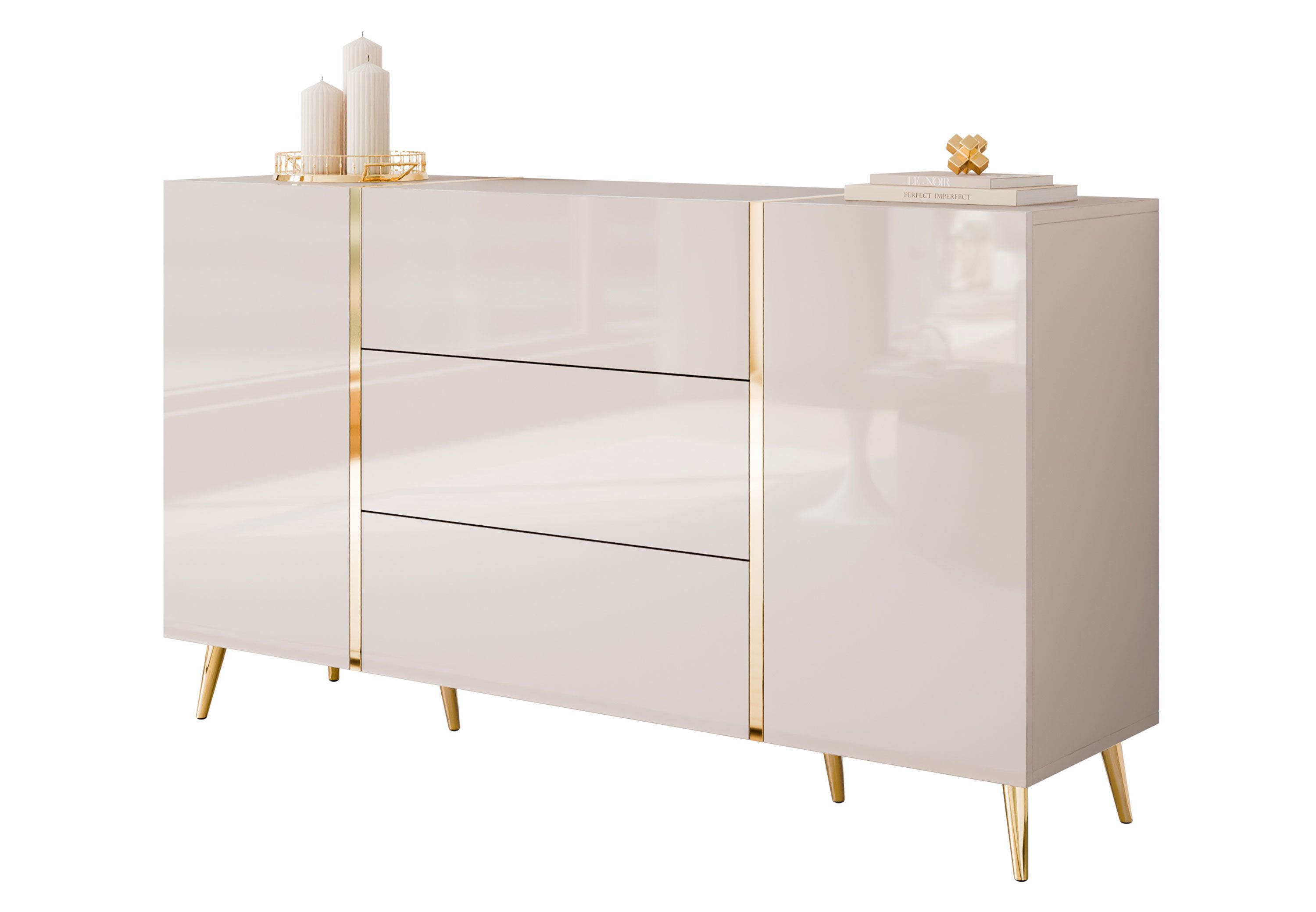 Kaschmirfarbe, glänzende Fronten und goldene Details verleihen der Kommode Luxus. Sie passt zu verschiedenen Einrichtungsstilen von klassisch bis minimalistisch.